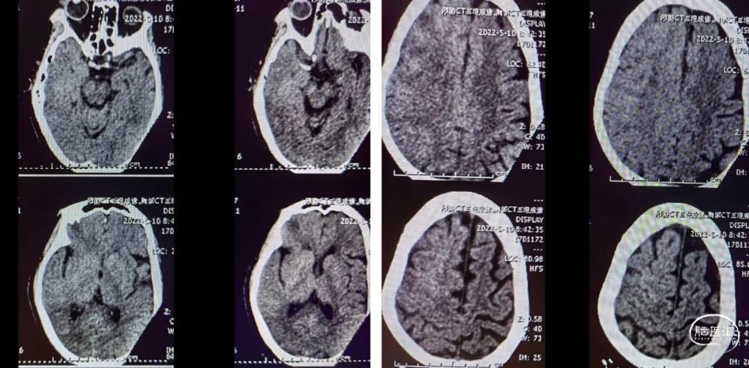 (术后7d CT)右侧放射冠区、右侧基底节区、右侧颞叶、额叶多发急性梗死。