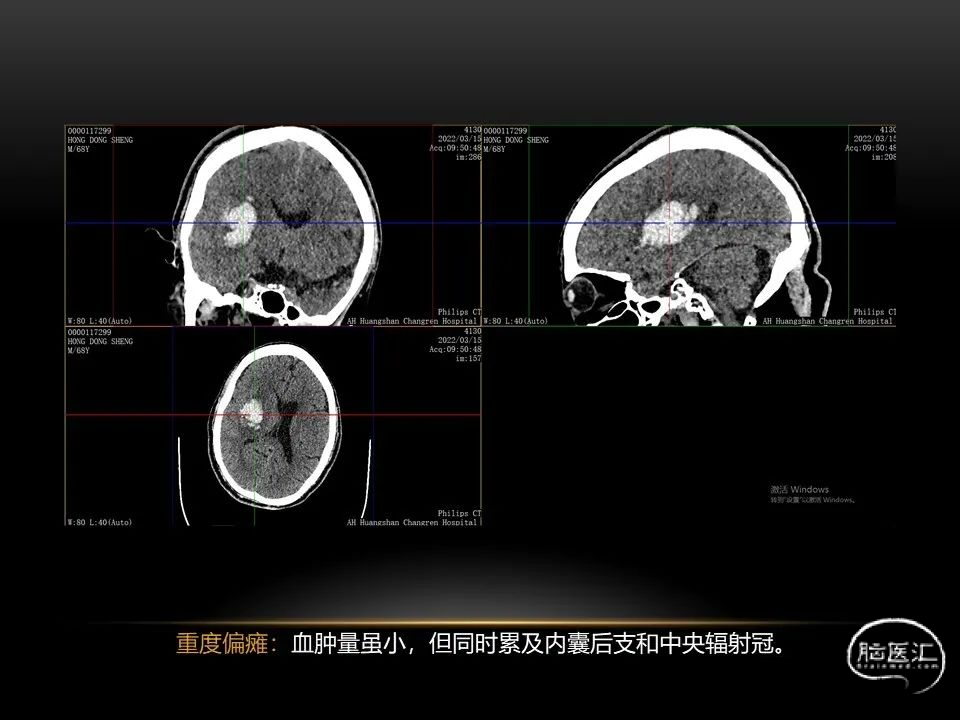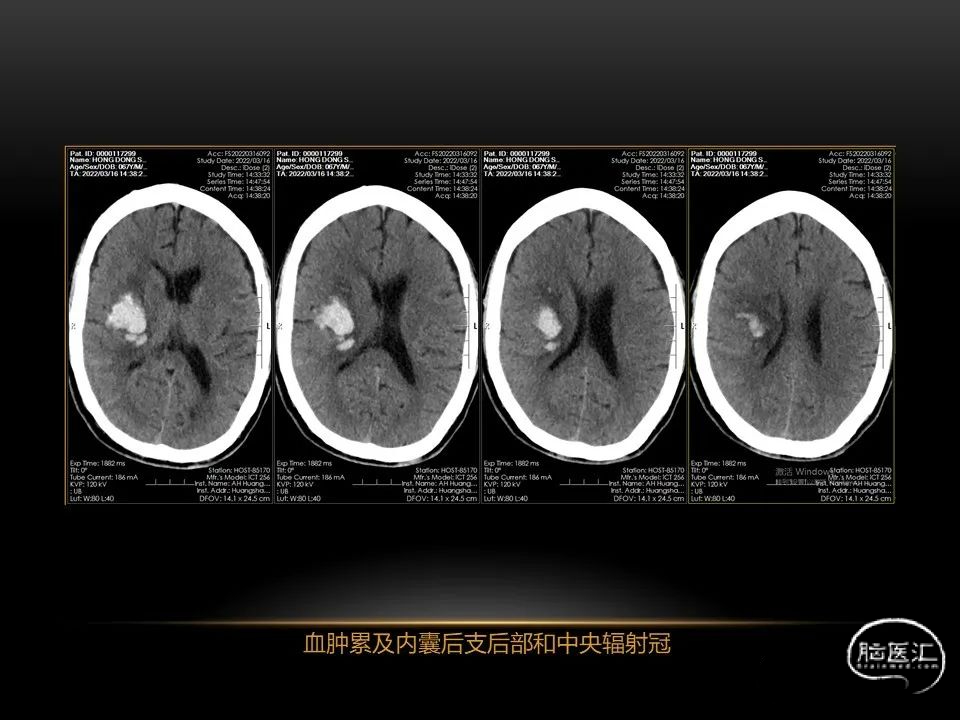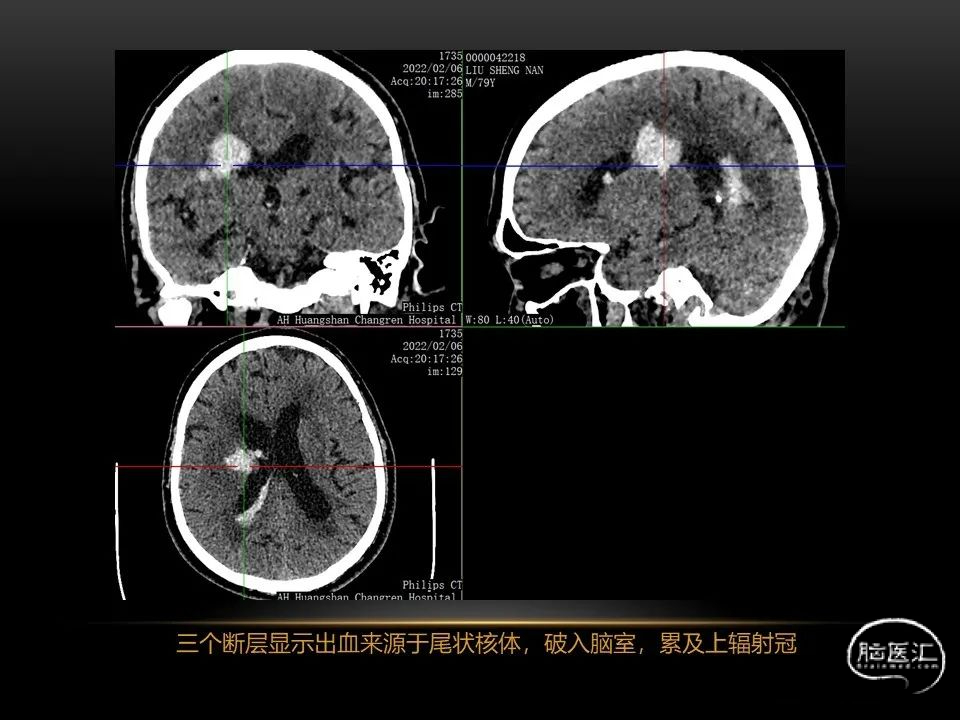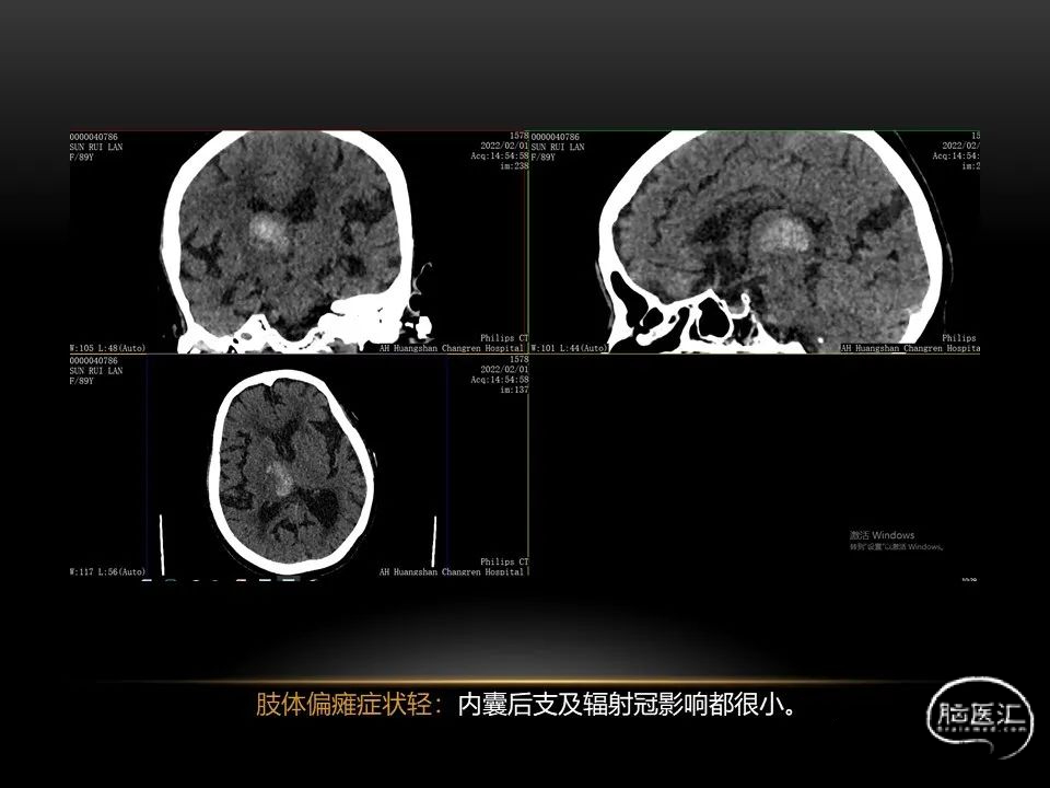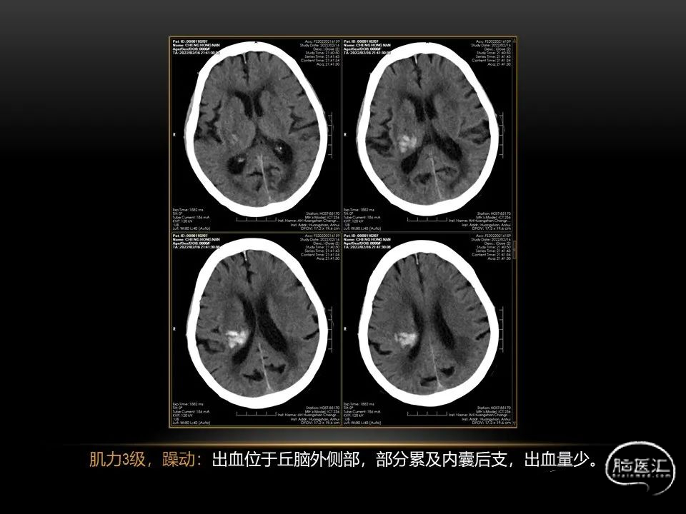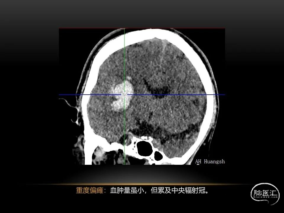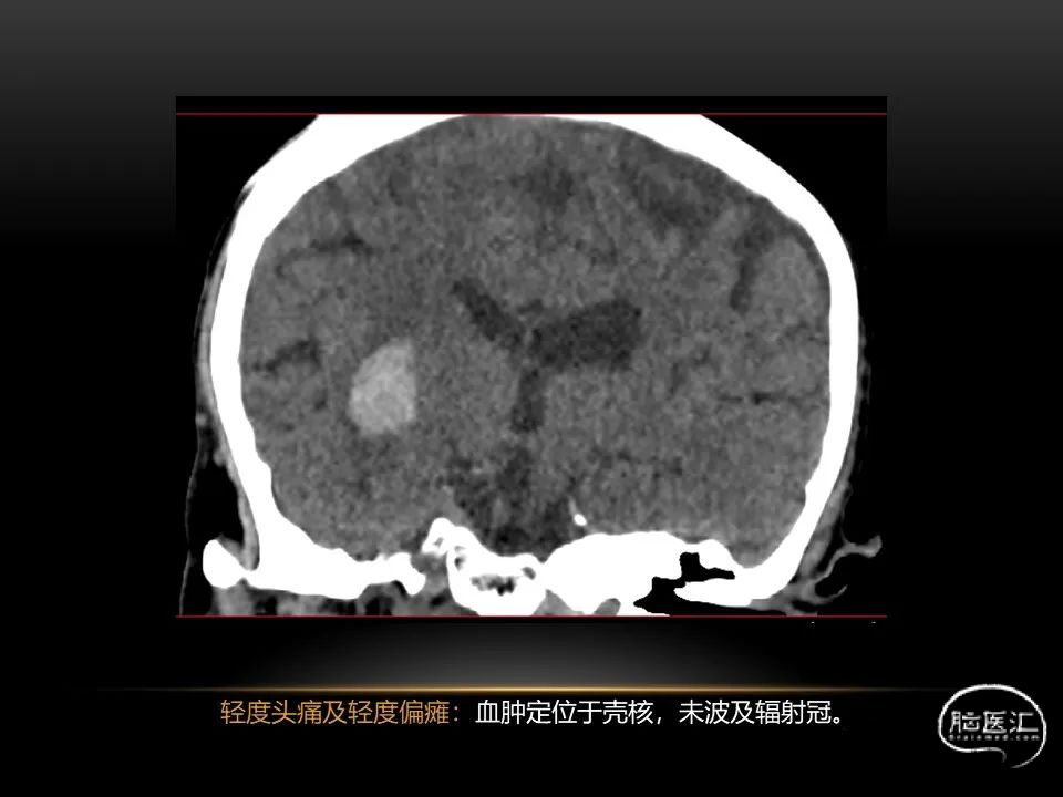 自发性脑出血不仅仅累及内囊后肢才会出现偏瘫及偏身感觉障碍,病变累及大脑脚或辐射冠同样有可能有类似症状和体征。内囊、辐射冠、大脑脚等结构之间是延续的,只是不同区域不同名称而已。定位诊断需要对解剖结构概念清晰,读片准确辨认,灵活掌握。