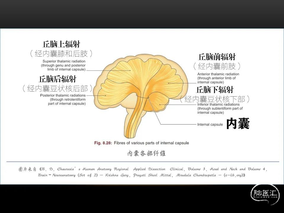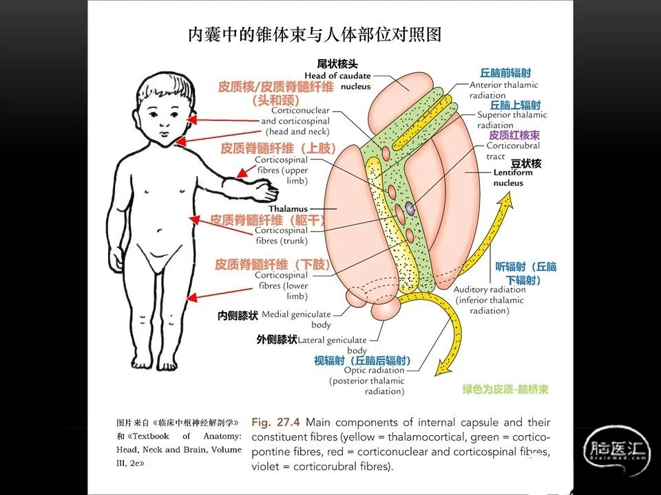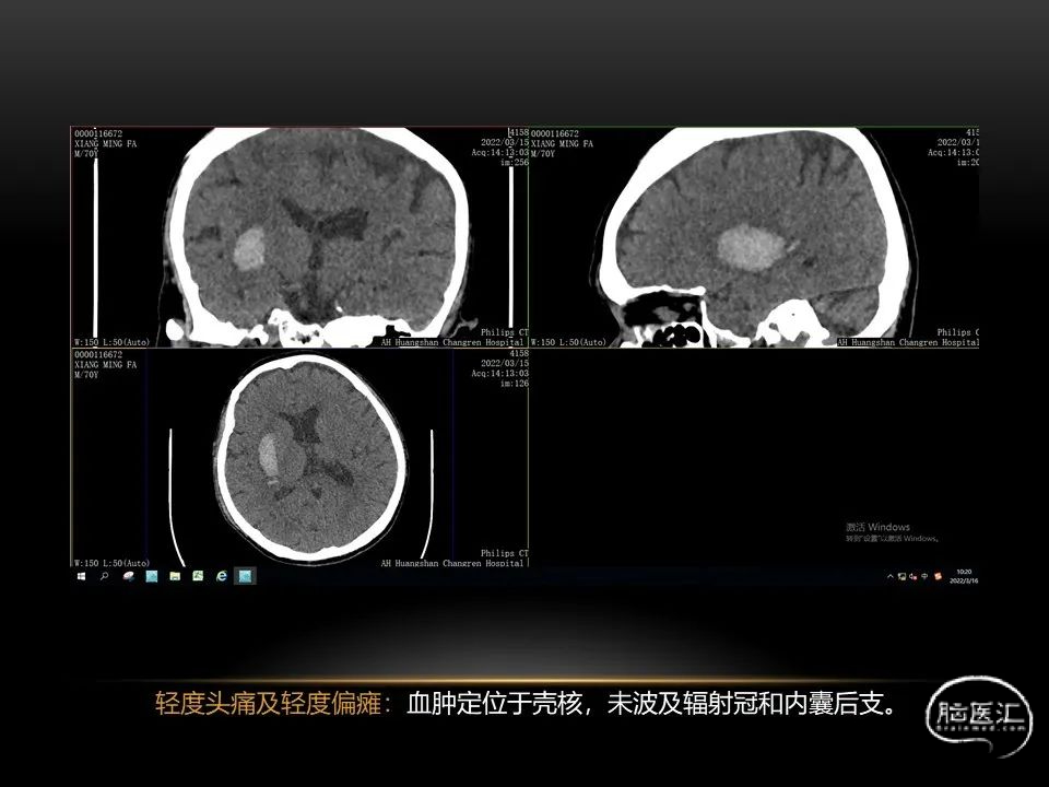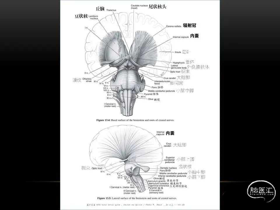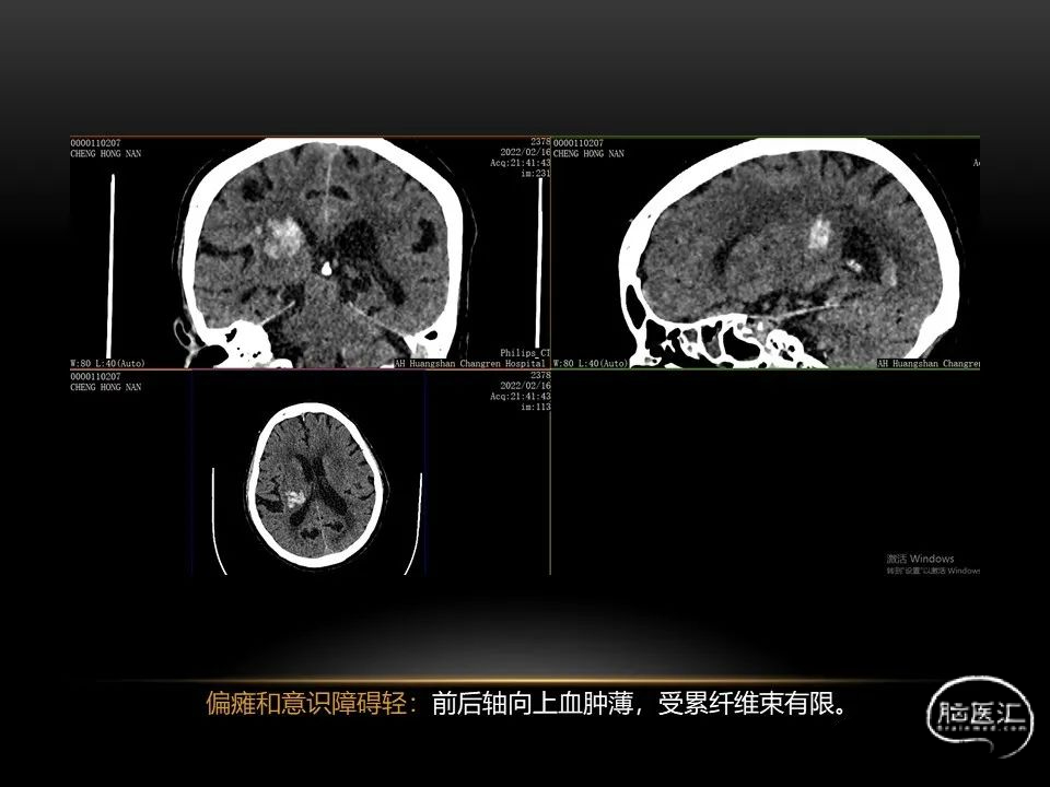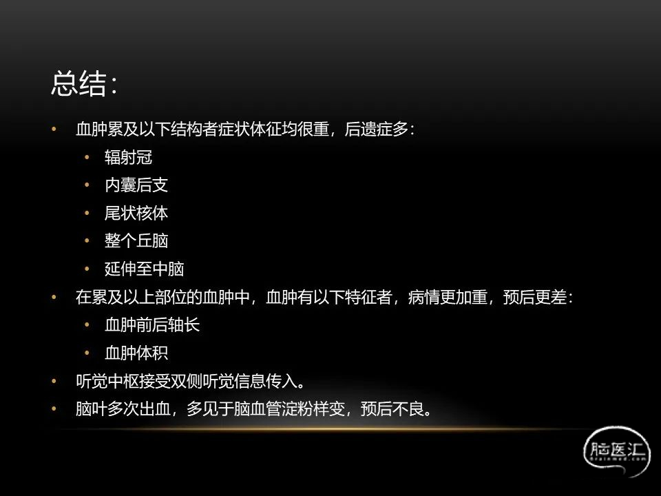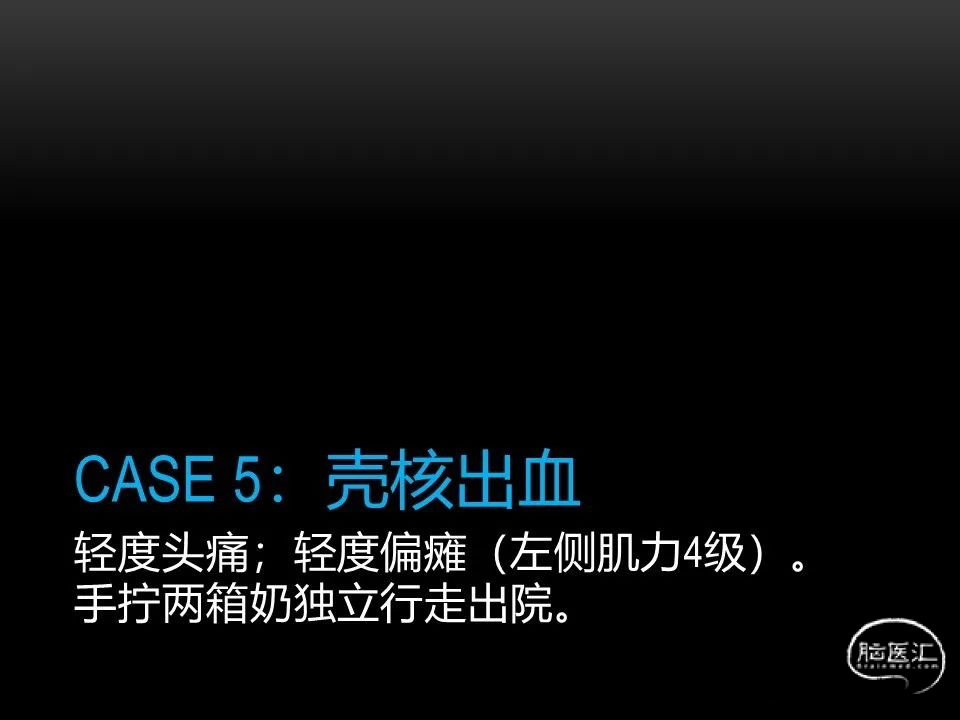 自发性脑出血不仅仅累及内囊后肢才会出现偏瘫及偏身感觉障碍,病变累及大脑脚或辐射冠同样有可能有类似症状和体征。内囊、辐射冠、大脑脚等结构之间是延续的,只是不同区域不同名称而已。定位诊断需要对解剖结构概念清晰,读片准确辨认,灵活掌握。