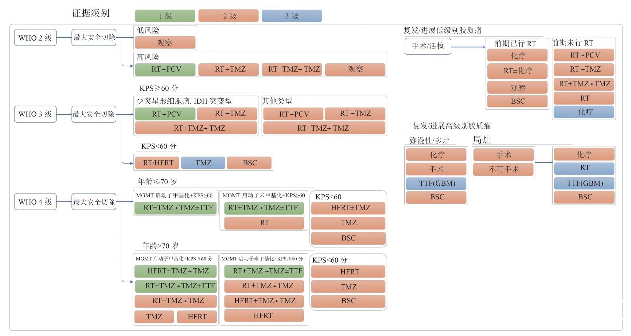 3、复发脑胶质瘤:目前尚无针对标准治疗后复发脑胶质瘤的标准化疗方案。如为高级别复发脑胶质瘤,强烈建议接受适当可行的临床试验;如无合适的临床试验,可尝试采用靶向治疗或铂类等药物治疗。综上所述,脑胶质瘤临床综合诊疗流程与推荐证据级别见图2。