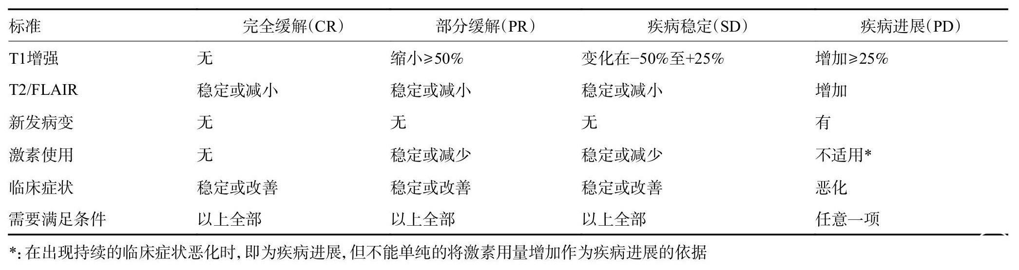 表1 神经肿瘤临床疗效评价方法(RANO标准)