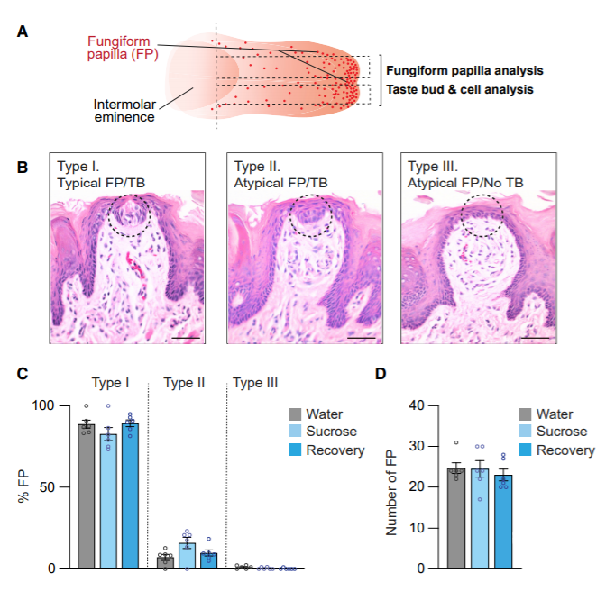 通过分析,研究者发现实验组大鼠味蕾所在的舌乳头结构,味蕾的数量并没有什么变化,这也侧面印证了为什么其他味觉反应没有发生变化。