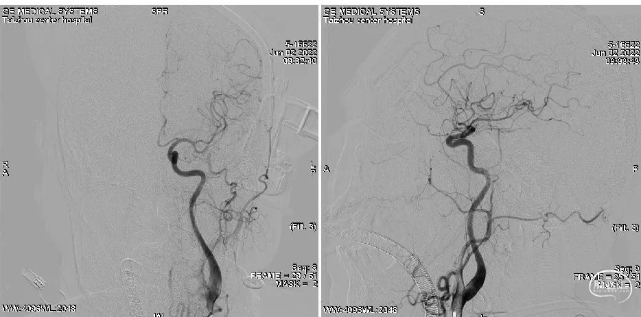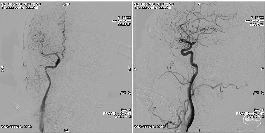 右侧颈总动脉造影:正侧位
