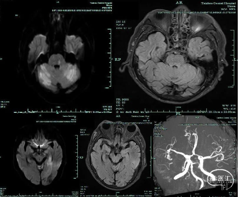 头颅MR:DWI提示左侧脑桥基底部、双侧小脑半球、左侧颞叶急性梗死,与FLAIR不匹配,左侧P2段不显影。