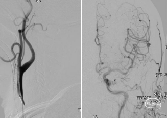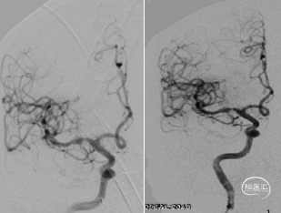 一次取栓实现血管再通,复查造影提示R-M1局限性狭窄,观察20分钟复查造影R-M1局限性狭窄无明显回缩,前向血流III级,因前向血流速度正常,故原位狭窄暂不同期处理,待病情稳定后择期处理。