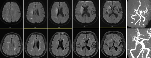 急诊绿色通道完善脑MR:1.右侧额顶叶、基底节区、岛叶、颞枕叶多发急性期梗死;2.右侧大脑中动脉重度狭窄或闭塞。