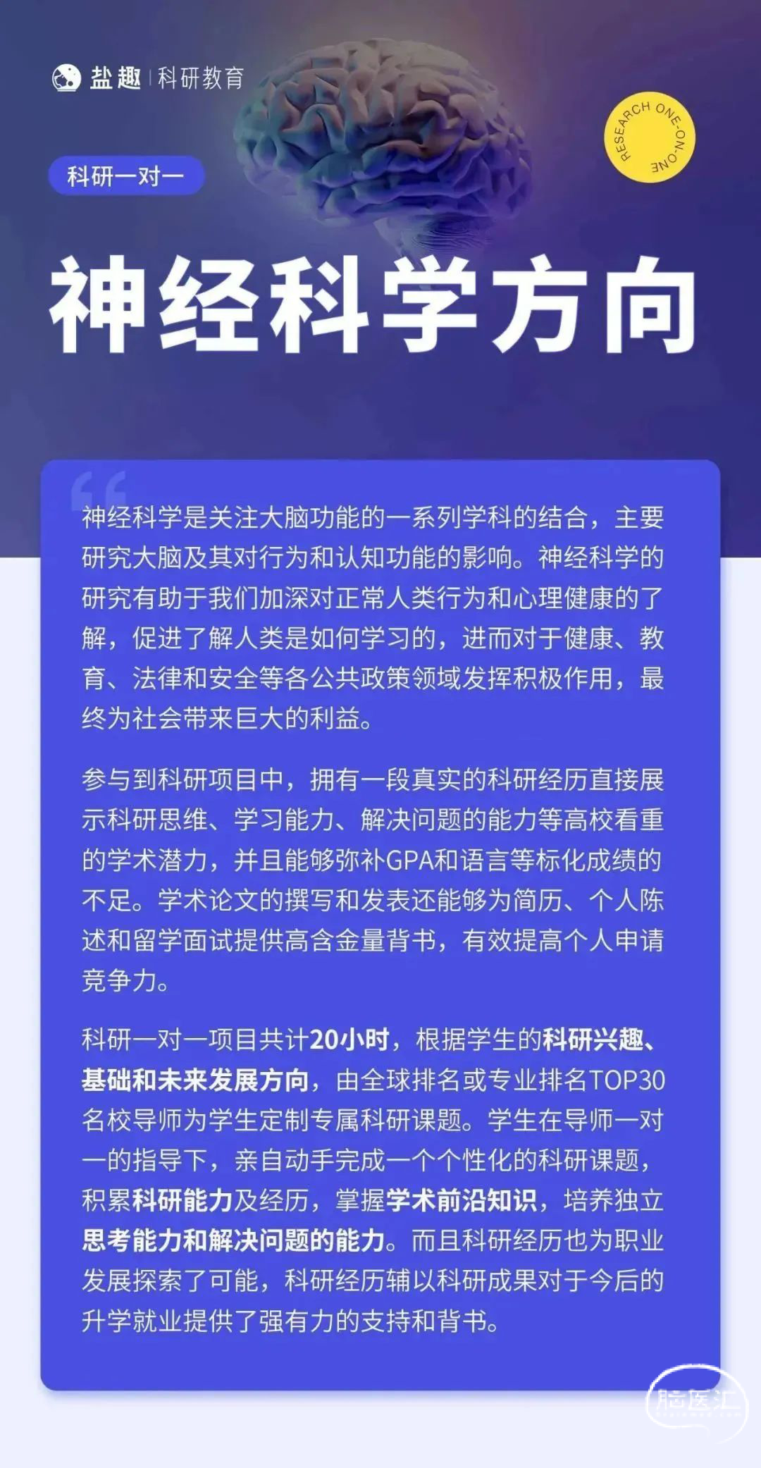除本课程之外,针对有更高论文需求的同学,盐趣还有神经科学方向科研一对一论文项目,海外top30导师一对一指导,n个课题方向随意选择。欢迎有兴趣的同学进一步了解,不要错过宝贵的机会!