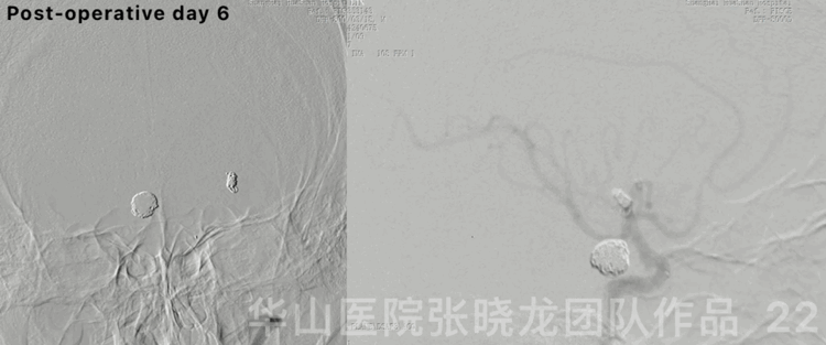 图 22 GIF. 术后6天复查造影,右侧小脑上动脉血流通畅,基底动脉瘤及左侧大脑中动脉瘤未见复发。此时脑梗后出血风险高于血栓风险,故抗血小板药物减至阿司匹林100mg+氯吡格雷25mg。