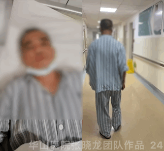 Figure 24 GIF. Three months after rehabilitation, speech and right muscle strength improved. The above video showed the patient condition 10 month after operation. NE: bilateral muscle strength v, right hand inflexibility, left leg hyperesthesia.