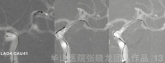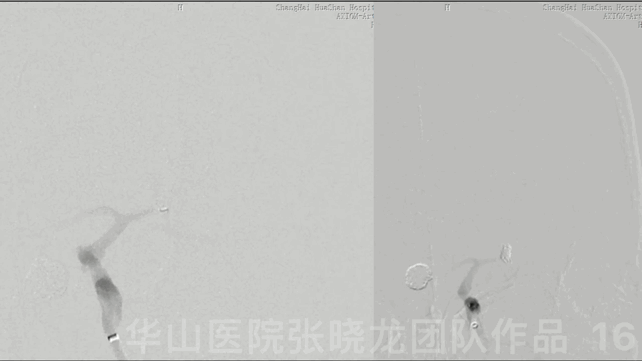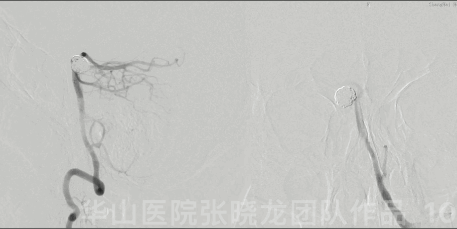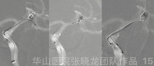 所以采用双微导管技术。一根微导管放在流出道用来保护小脑上动脉,另一根栓塞微导管致密栓塞流出道。