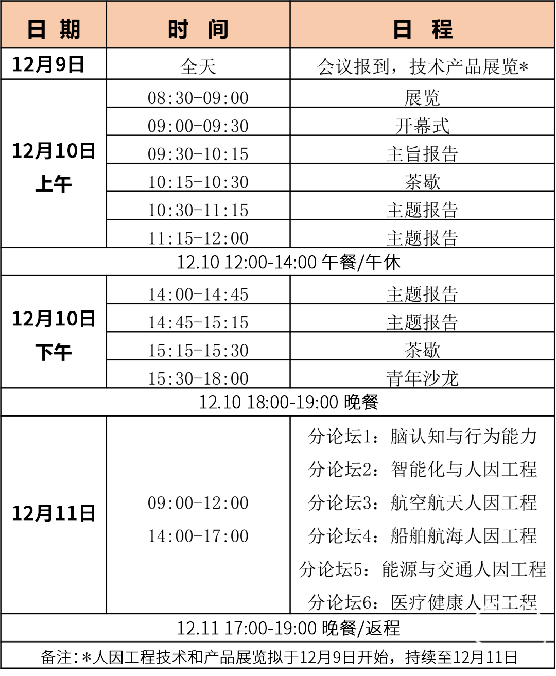 论坛设置主题报告、青年沙龙、分论坛、人因工程技术产品展览等内容,整体日程安排如下: