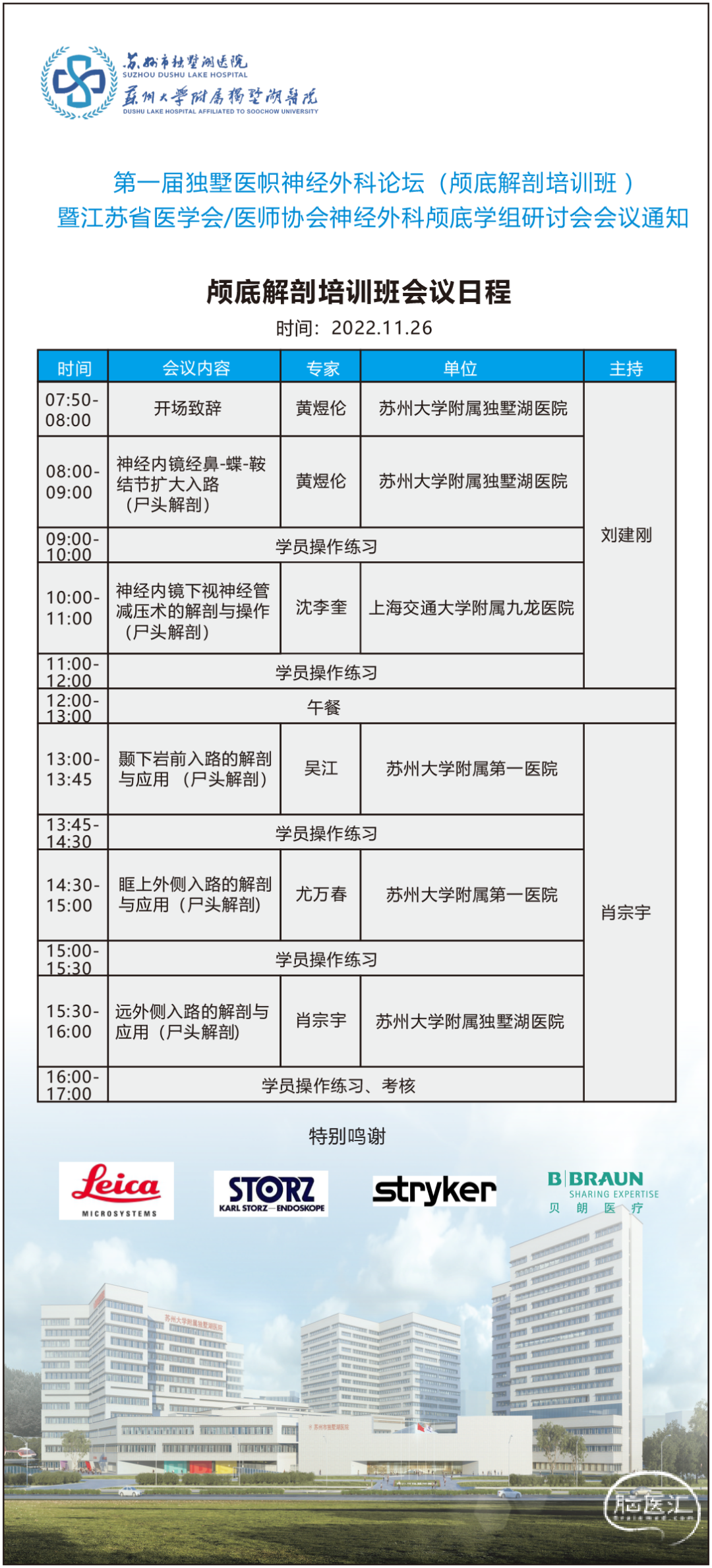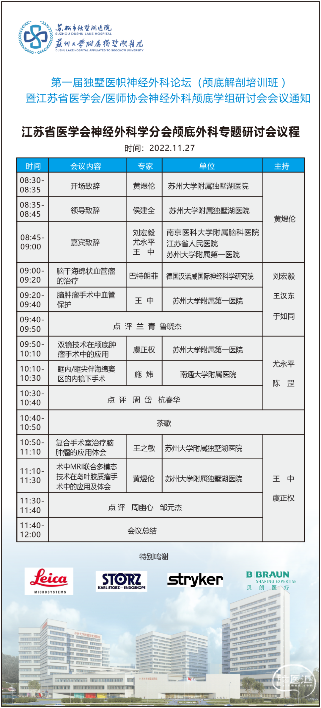 为推动江苏省神经外科学颅底外科发展,提高颅底外科技术水平,苏州大学附属独墅湖医院定于2022年11月26-27日在苏州市召开第一届独墅医帜神经外科论坛暨江苏省医学会/医师协会神经外科颅底学组国际研讨会。本次会议邀请到了国际著名神经外科大师巴特朗菲教授来院讲课并进行延髓手术直播。本次会议由江苏省医学会/医师协会联合主办,苏州大学附属独墅湖医院承办。