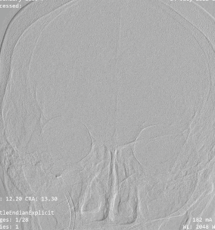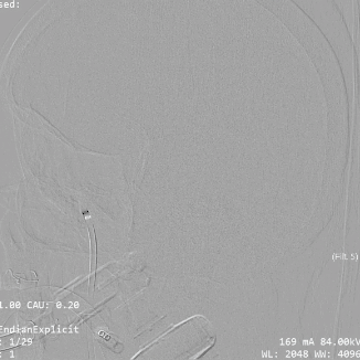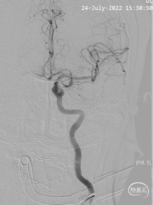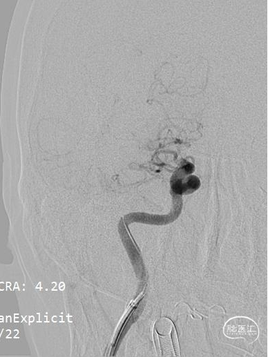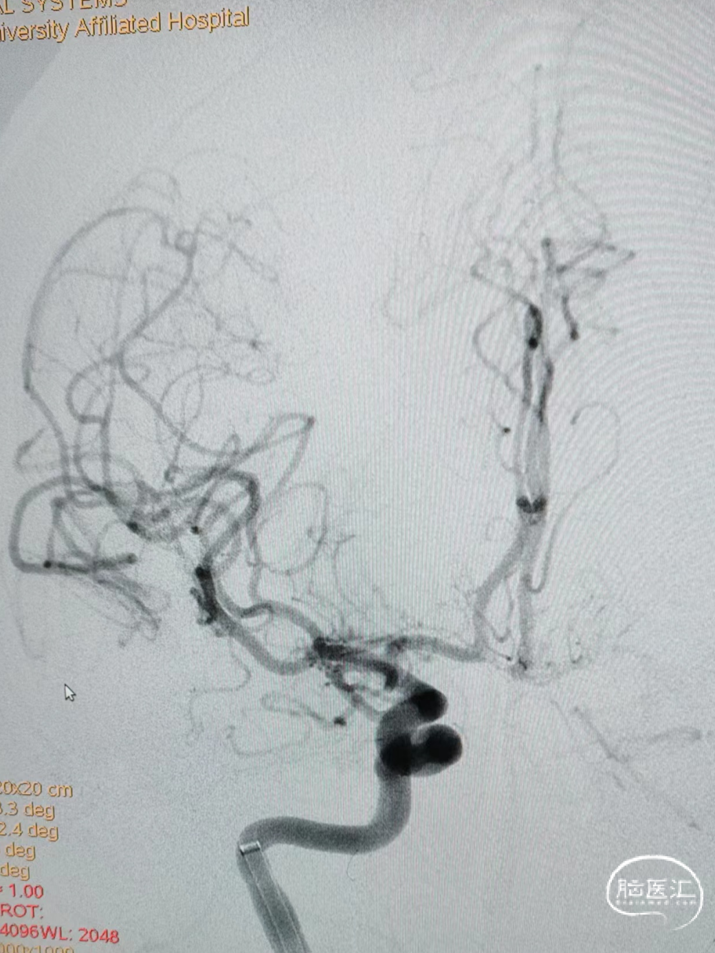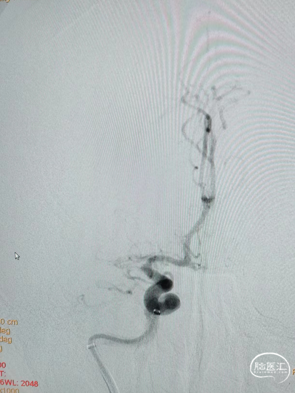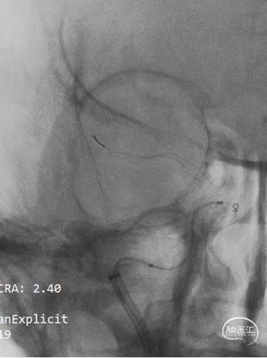 简要病史:患者于入院前5小时在上厕所时出现左侧肢体乏力,倒地,伴言语不清,伴恶心、呕吐。在当地医院行静脉溶栓后症状无改善,行CTA示右侧颈内动脉闭塞,遂转入我院,经急诊绿色通道入介入导管室。