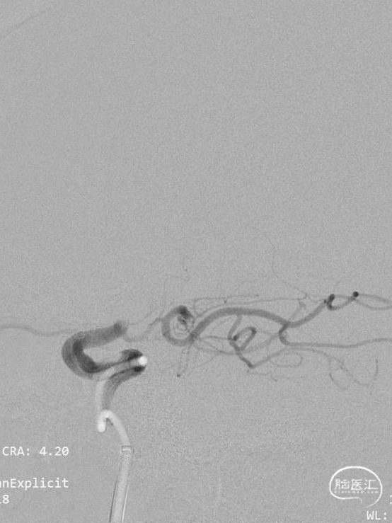 经过抽吸导管抽吸后造影见颈内动脉通畅,大脑前动脉显影,但大脑中动脉仍然闭塞。
