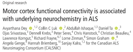 [Dey A, Luk CC, Ishaque A, Ta D, Srivastava O, Krebs D, Seres P, Hanstock C, Beaulieu C, Korngut L, Frayne R, Zinman L, Graham S, Genge A, Briemberg H, Kalra S; Canadian ALS Neuroimaging Consortium (CALSNIC). Motor cortex functional connectivity is associated with underlying neurochemistry in ALS. J Neurol Neurosurg Psychiatry. 2022 Nov 15:jnnp-2022-329993. doi: 10.1136/jnnp-2022-329993. Epub ahead of print. PMID: 36379713.]