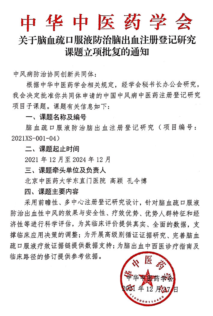 为了推动脑血疏口服液防治原发性脑出血的效果与安全性、疗效优势、优势人群特征和经济性等方向的科学评估,让其临床评价具备更加真实、全面的数据,以支撑临床应用决策的调整并提供高级别循证证据研究、完善脑血疏口服液疗效及安全性证据链,为脑出血中西医诊疗指南及临床路径的修订提供参考依据,北京中医药大学东直门医院与山东沃华医药科技股份有限公司共同合作了《脑血疏口服液防治脑出血注册登记研究》项目,项目获得中华中医药学会立项,计划50家临床研究中心参与,完成2000例病例观察。