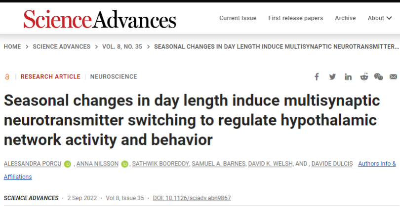 Davide Dulcis研究团队应用小鼠动物模型发现,SCN内的神经调节肽S(NMS)和血管活性肠肽(VIP)神经元参与了光周期诱导的神经递质变化的可塑性。体内记录钙离子动态显示,NMS神经元改变PVN网络活性以响应冬季样光周期。慢性操控NMS神经元足以诱导PVN内神经元神经递质的转换,并影响运动活动。