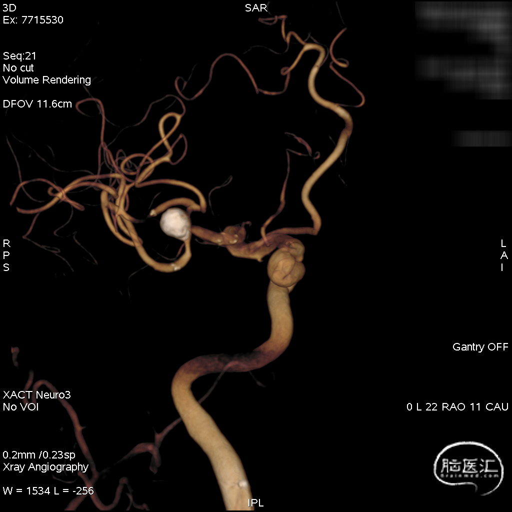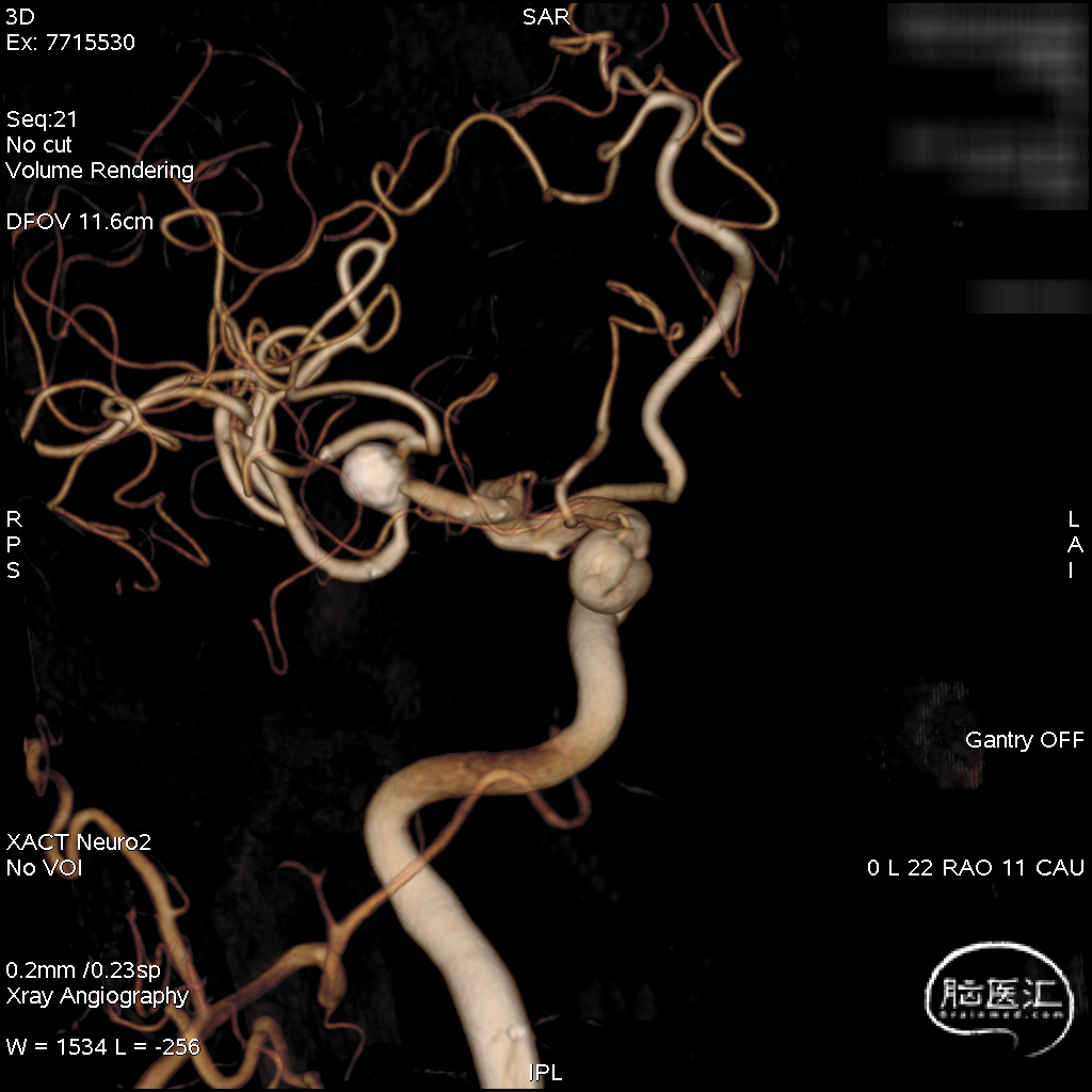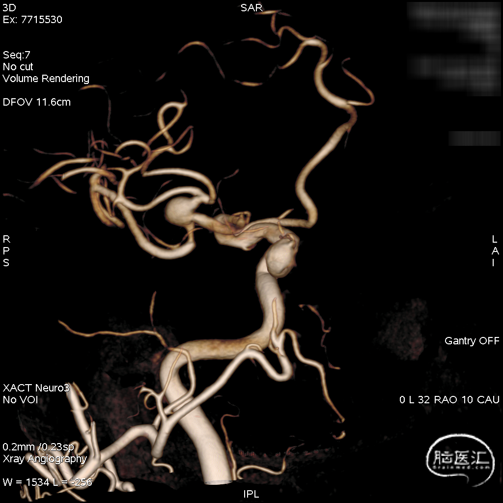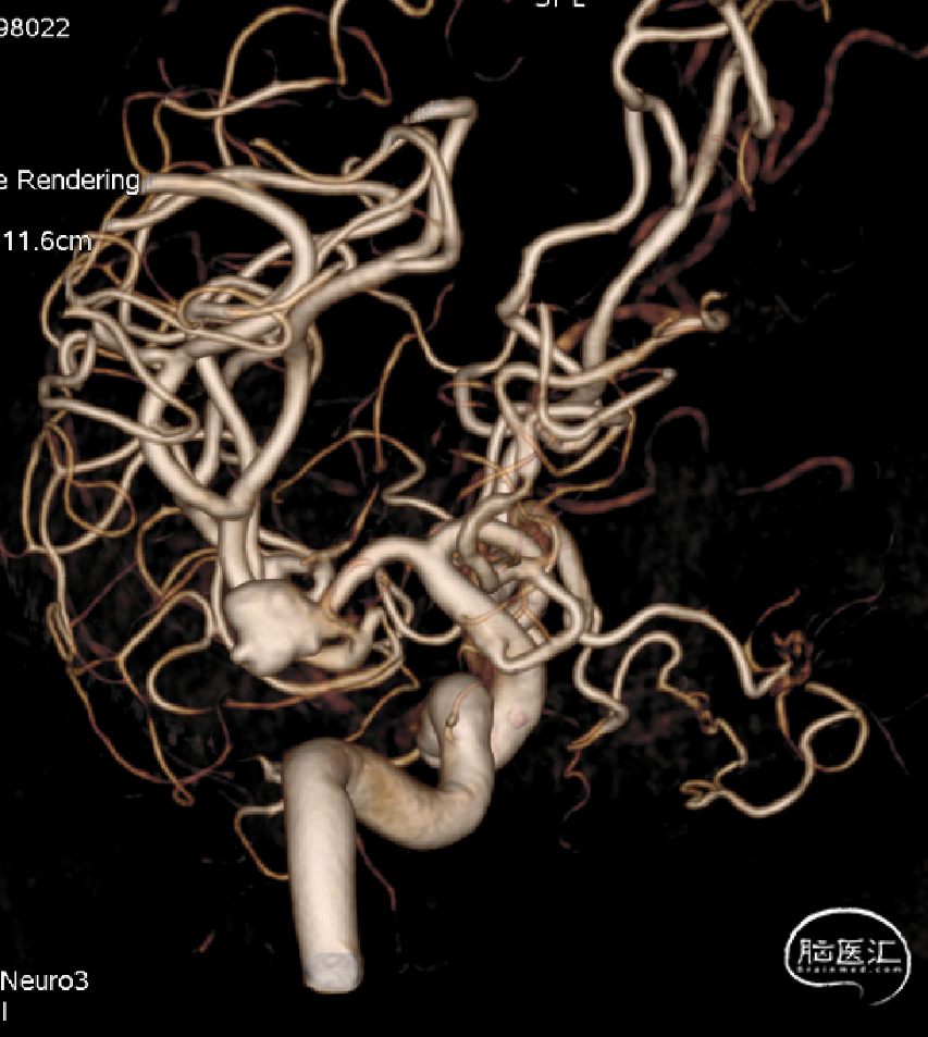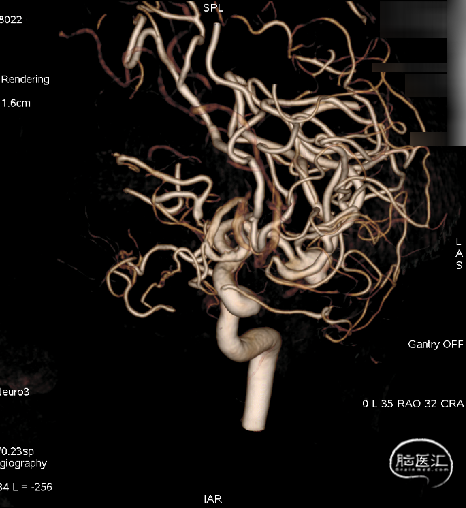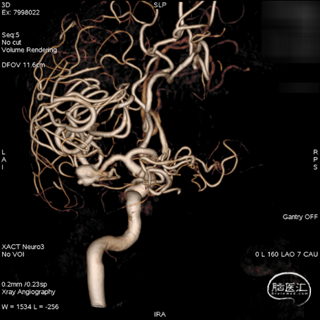 三维重建:显示左侧MCA分叉部未破裂动脉瘤,约8.2mm*8.6mmm,瘤颈3.8mm,顶端有子瘤。