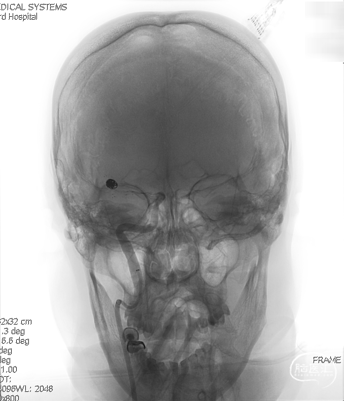 复查标准正侧位造影,右侧ICA、MCA、ACA主干及分支良好,动脉瘤栓塞满意。