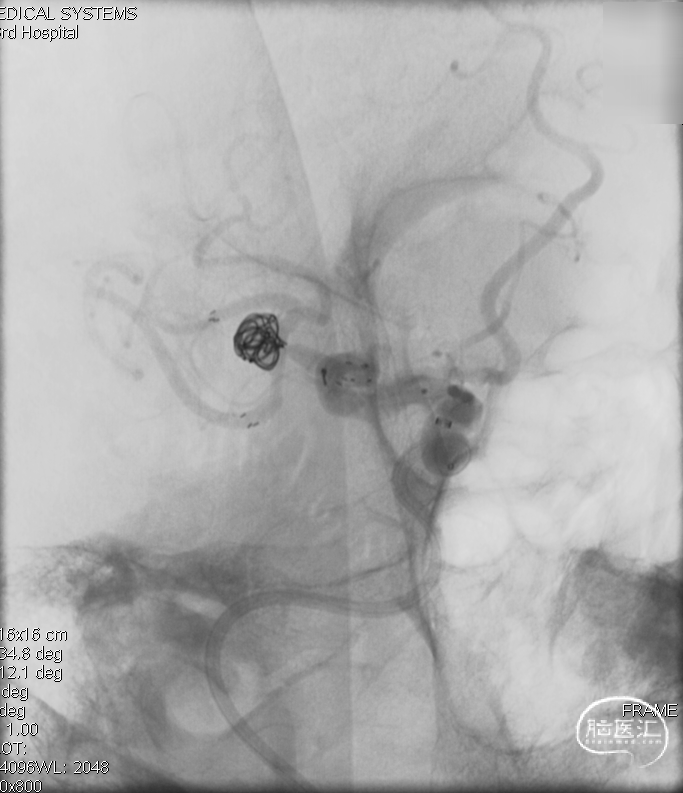 选定工作位后,跨动脉瘤释放3.0mm*21mm Atlas支架一枚,复查满意、形态良好,再次利用Synchro导丝引导下带入SL-10进入MCA下干,定位满意后释放3.0mm*21mm Atlas支架支架一枚,形成Y形支架辅助栓塞。然后经动脉瘤腔内预置栓塞微导管,依次送入弹簧圈,填塞动脉瘤腔。