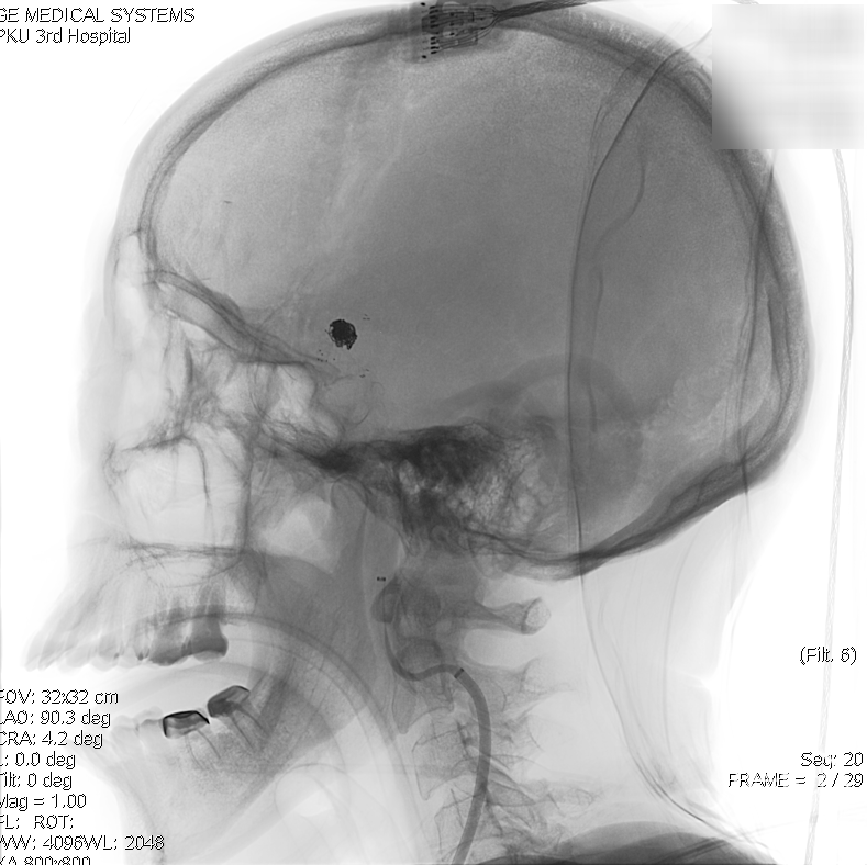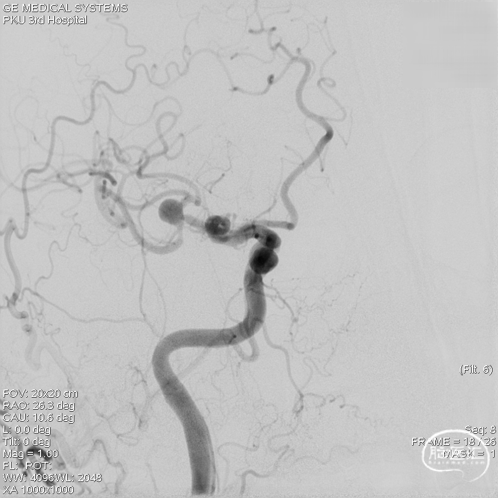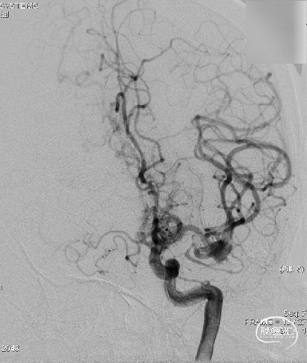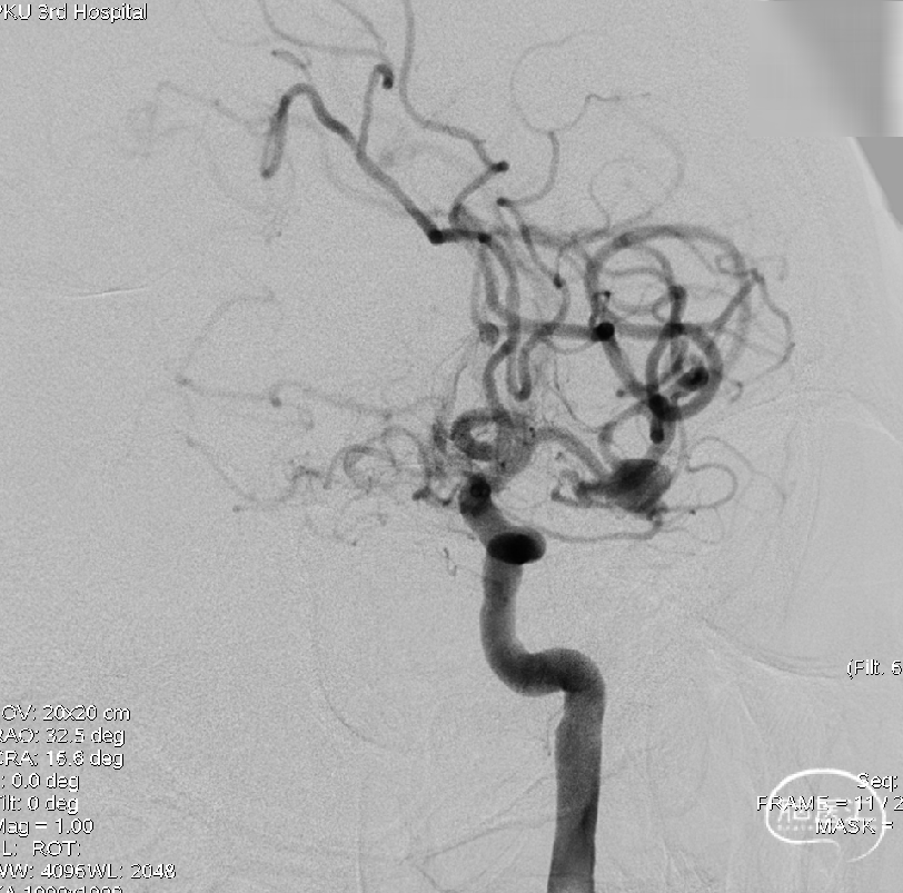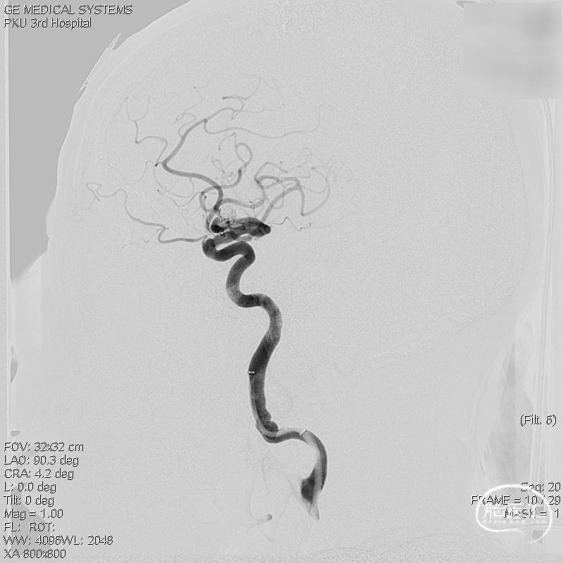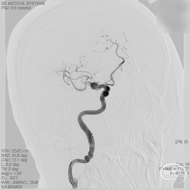复查标准正侧位造影, ICA、MCA、ACA主干及远端分支良好,动脉瘤栓塞满意。