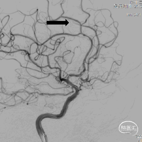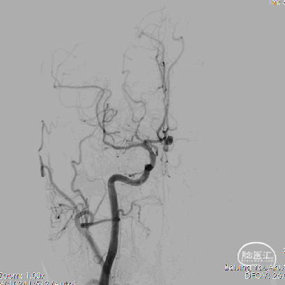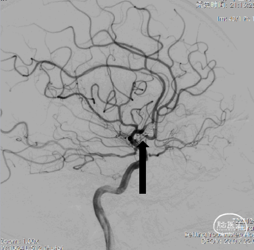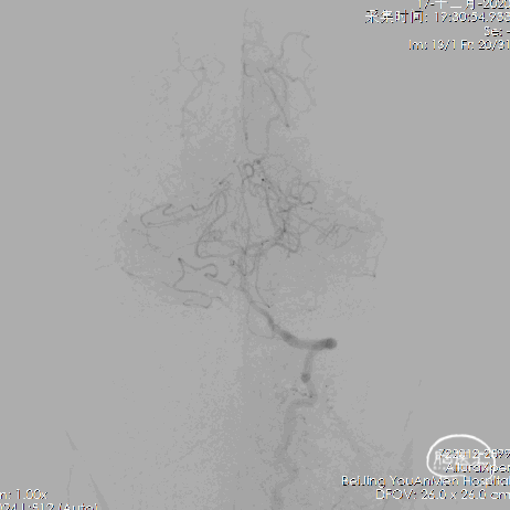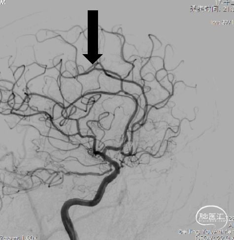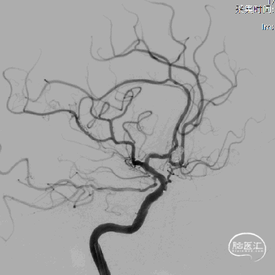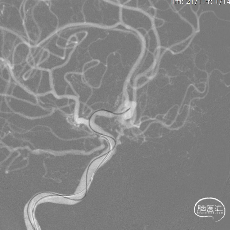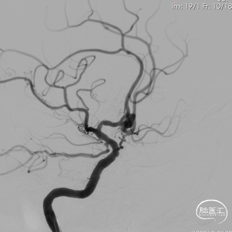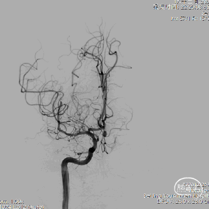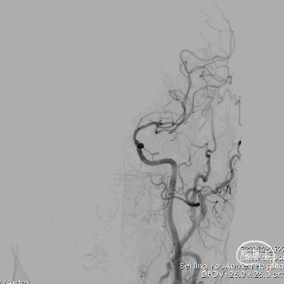 1、右侧颈内动脉造影提示双侧大脑前动脉显影,前交通动脉可见动脉瘤。