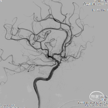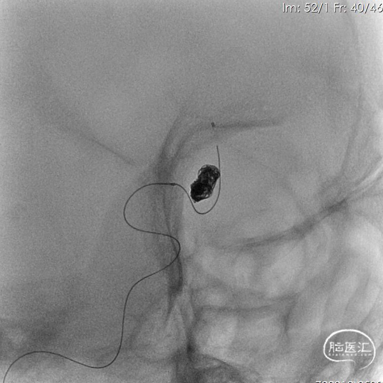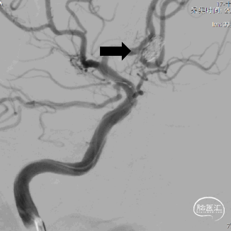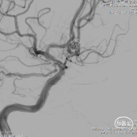 11、反复造影观察后血流速度仍然减慢,造影见少量弹簧圈突入前交通动脉。