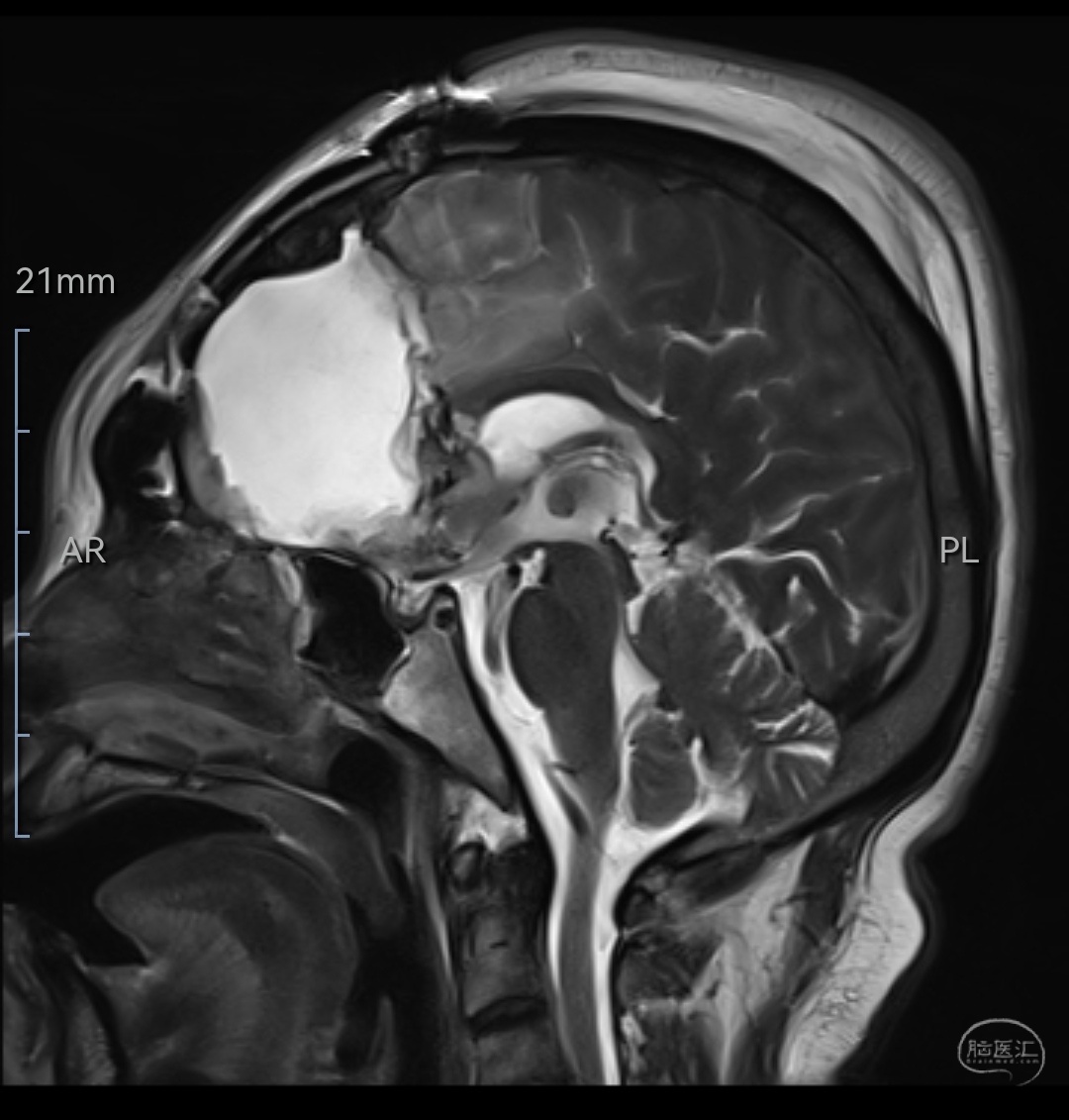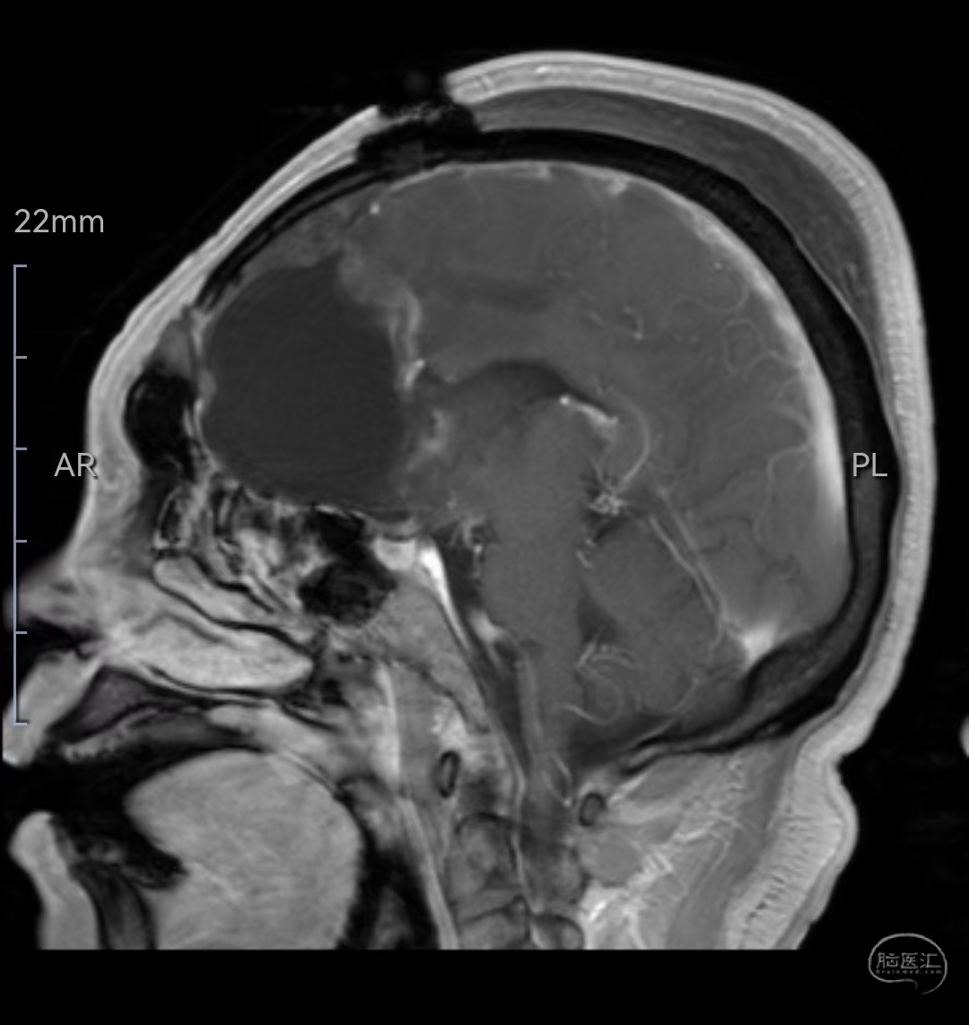 MRI增强矢状位示肿瘤全切除,毗邻脑组织保护满意