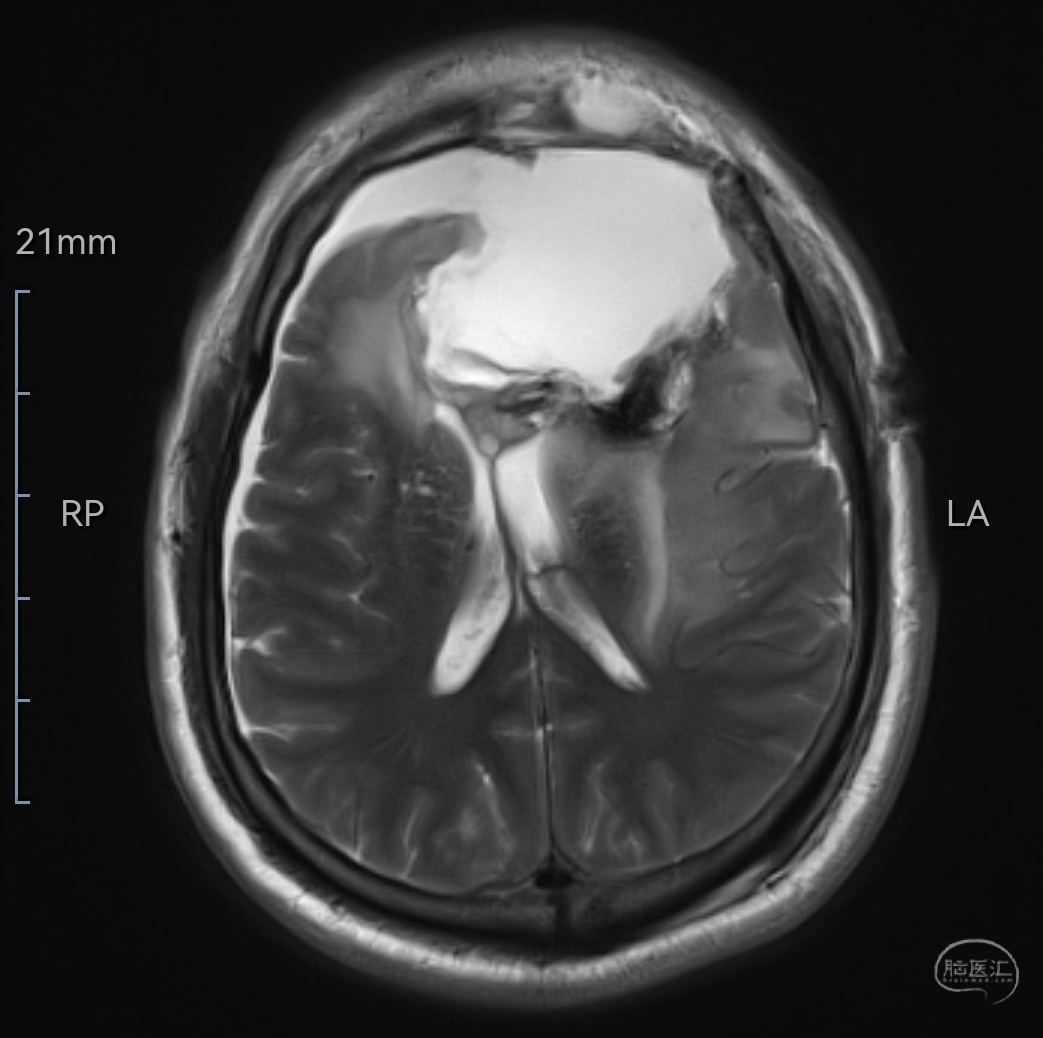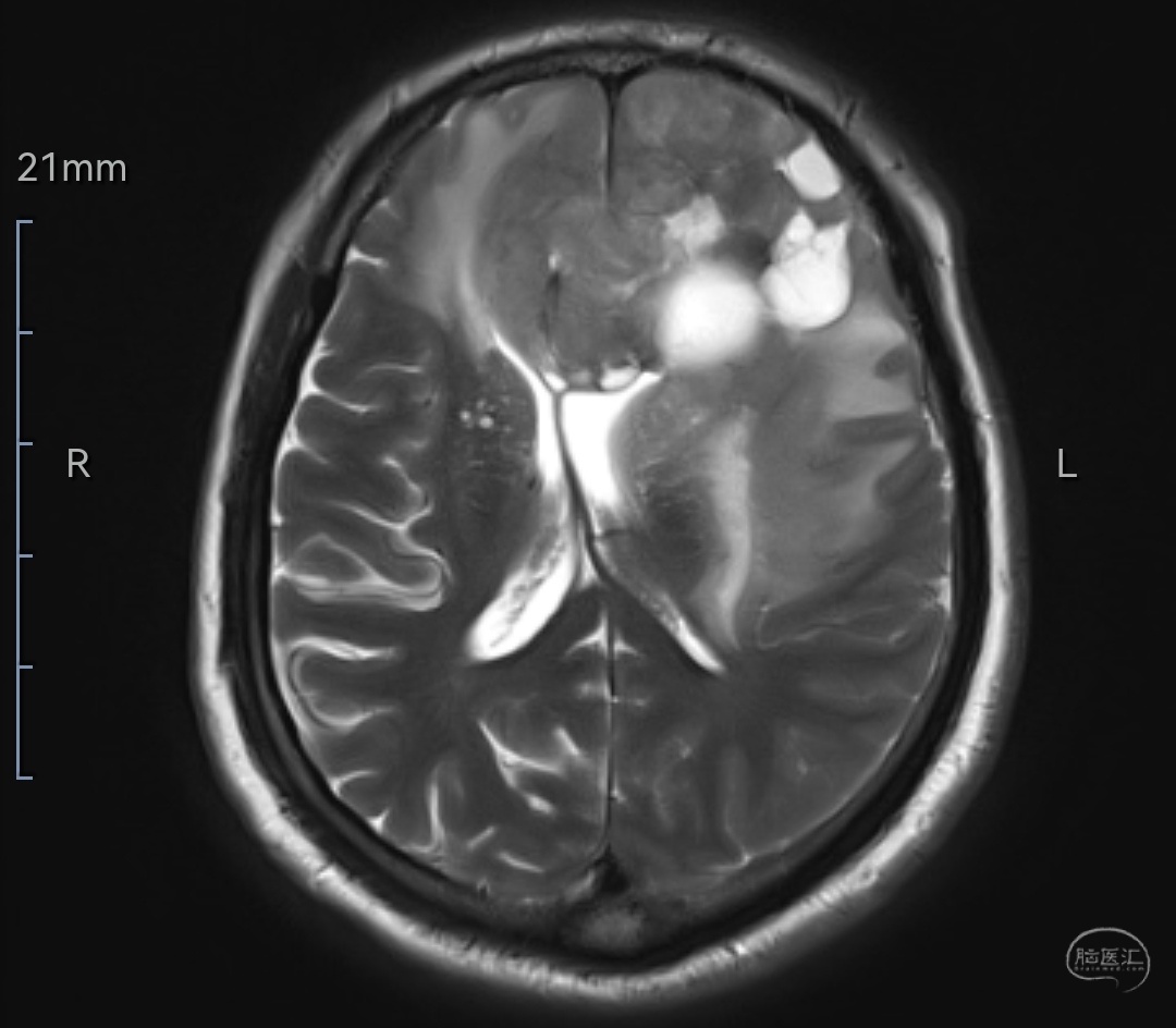 MRIT2相轴位示肿瘤等高信号,位于双侧额叶,左侧为主,已侵犯至胼胝体嘴、膝部及左侧颞岛叶,伴有明显水肿