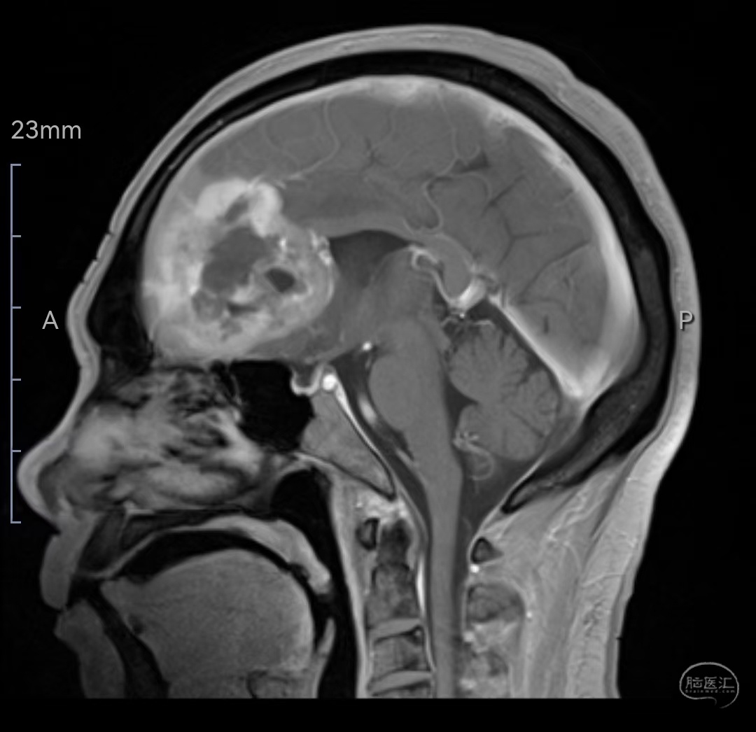 MRI增强矢状位示肿瘤明显强化,侵犯压迫至胼胝体嘴、膝部