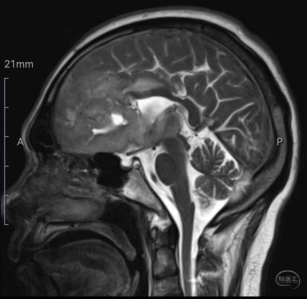 MRIT2相矢状位示肿瘤位于双侧额叶,左侧为主,已侵犯至胼胝体嘴、膝部