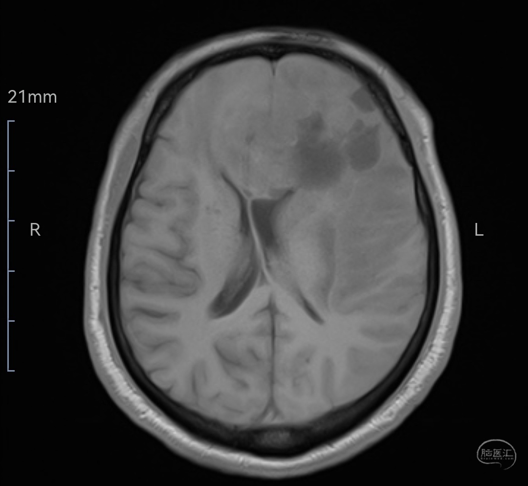 MRIT1相轴位示肿瘤等信号,位于双侧额叶,左侧为主,已侵犯至胼胝体嘴、膝部及左侧颞岛叶