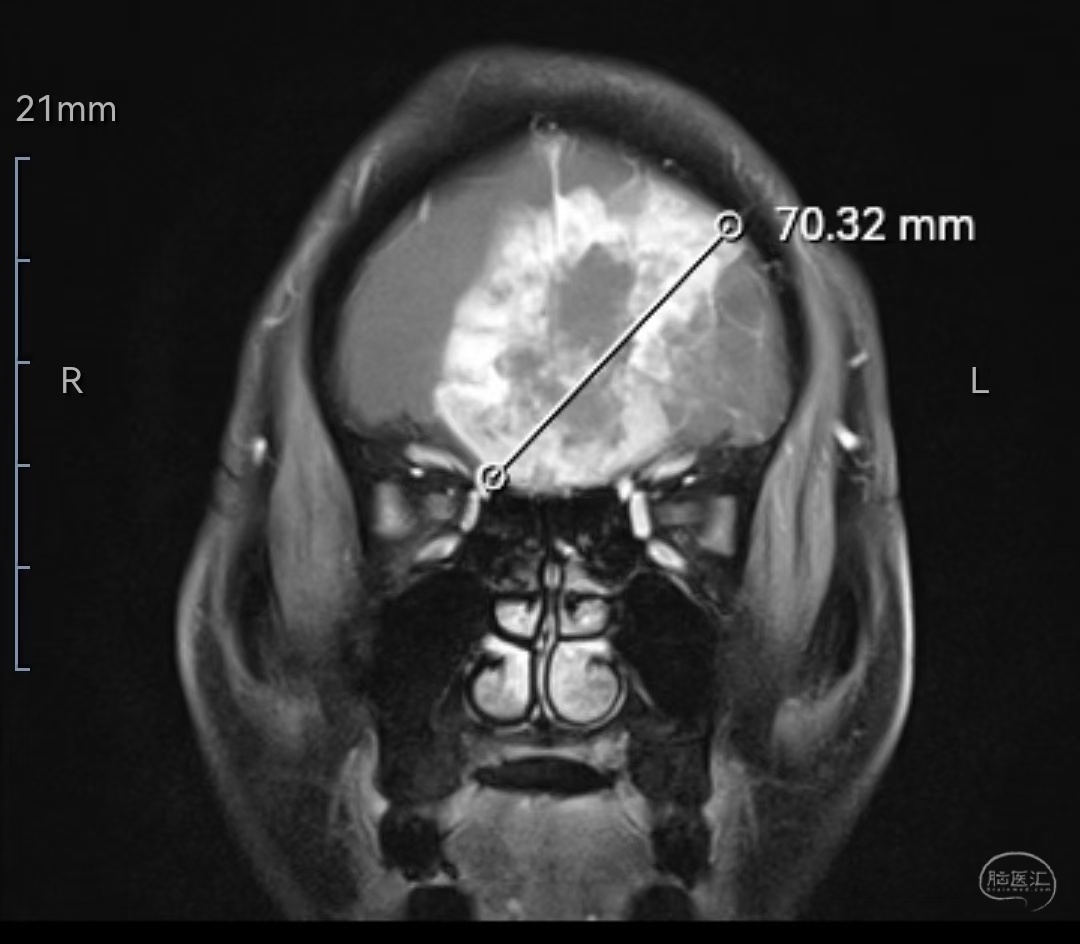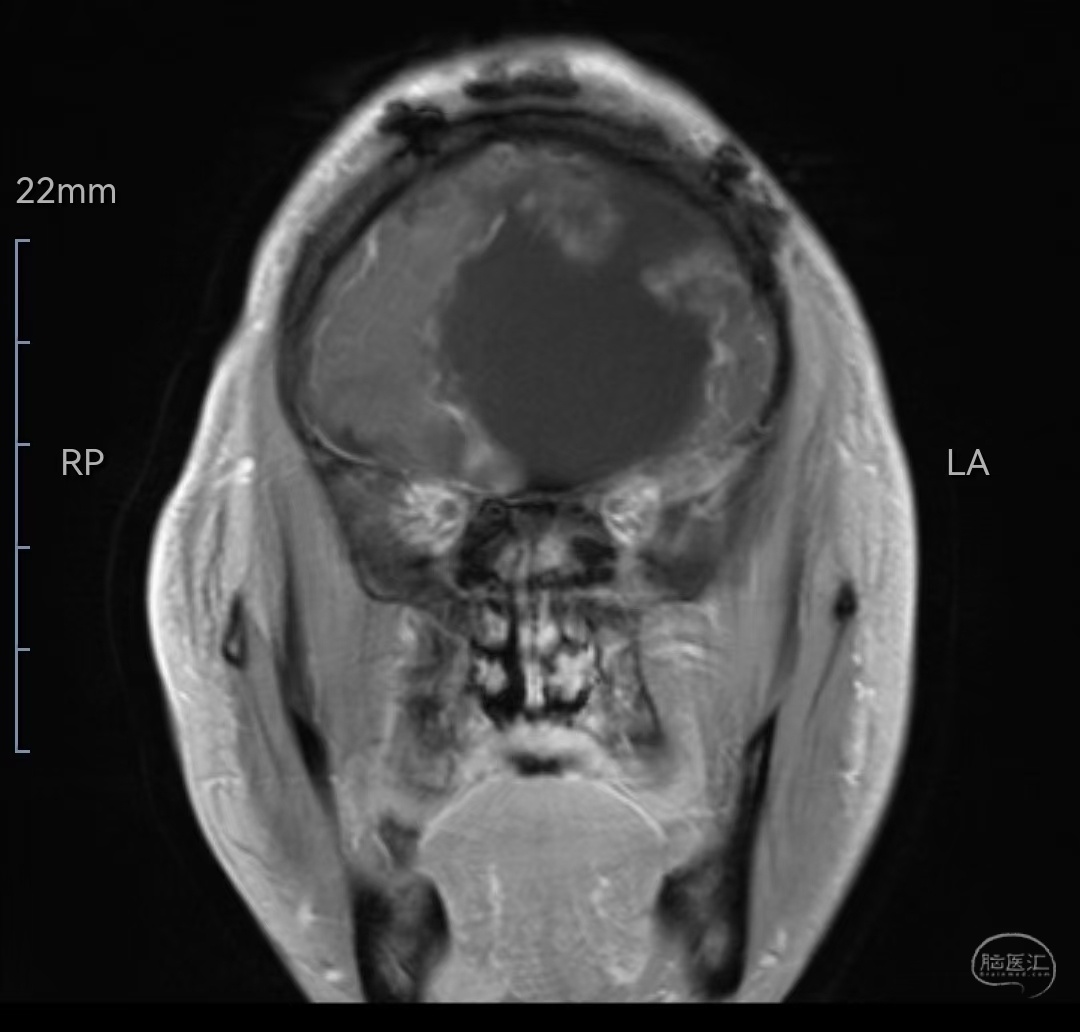 MRI增强冠状位示肿瘤明显强化,位于双侧额叶,左侧为主