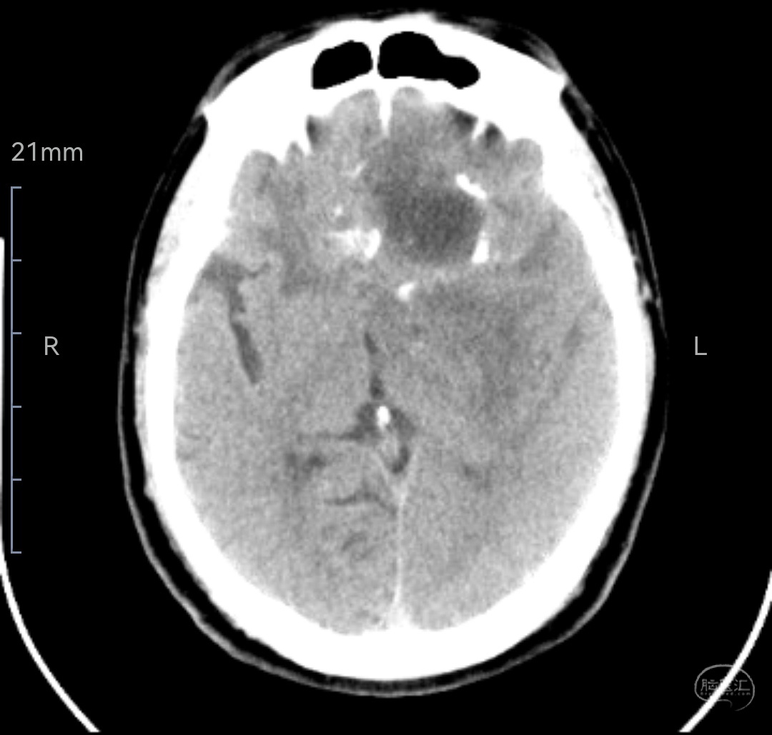 术前CT及磁共振检查:双侧额叶巨大肿瘤,左侧为主。