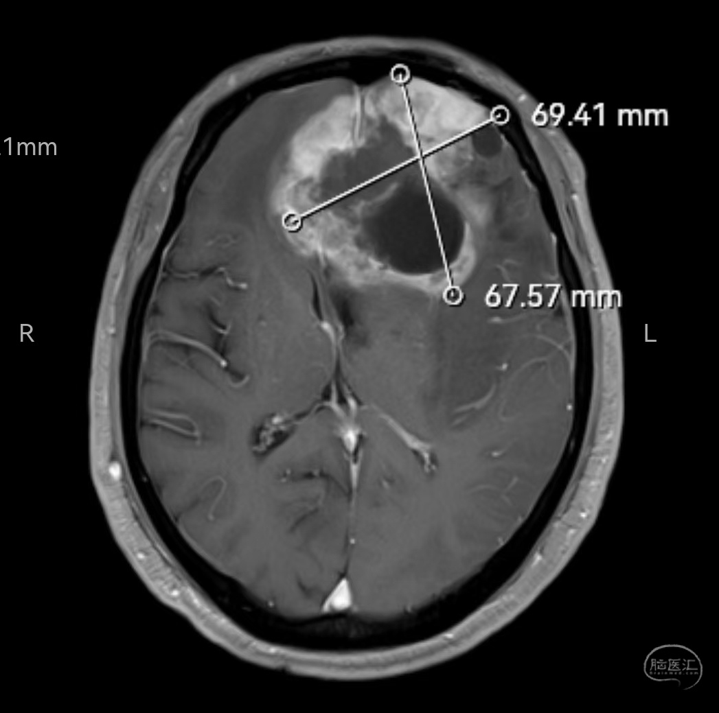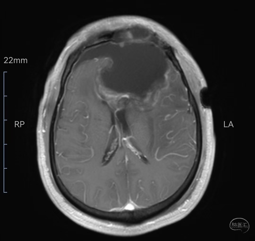 MRI增强轴位示肿瘤明显强化,位于双侧额叶,左侧为主,已侵犯至胼胝体嘴、膝部及左侧颞岛叶。肿瘤最大直径7厘米