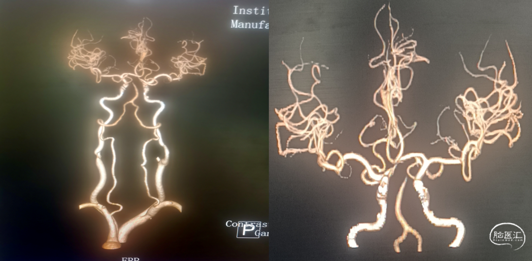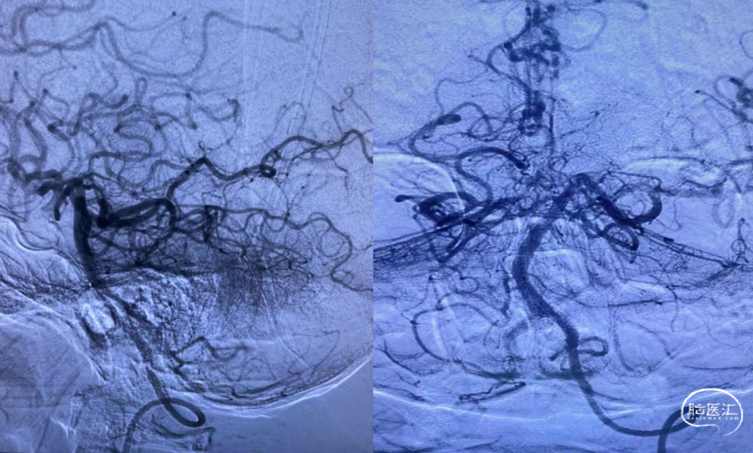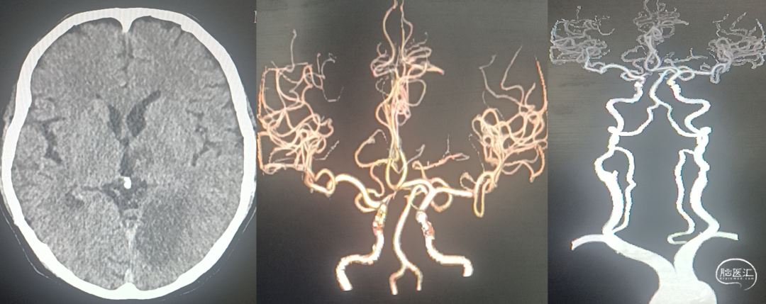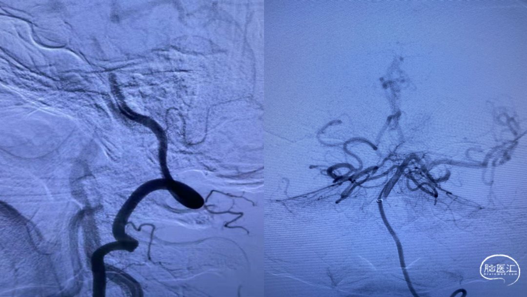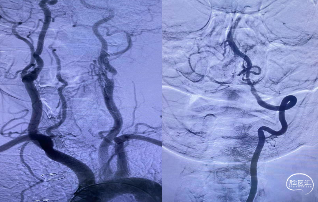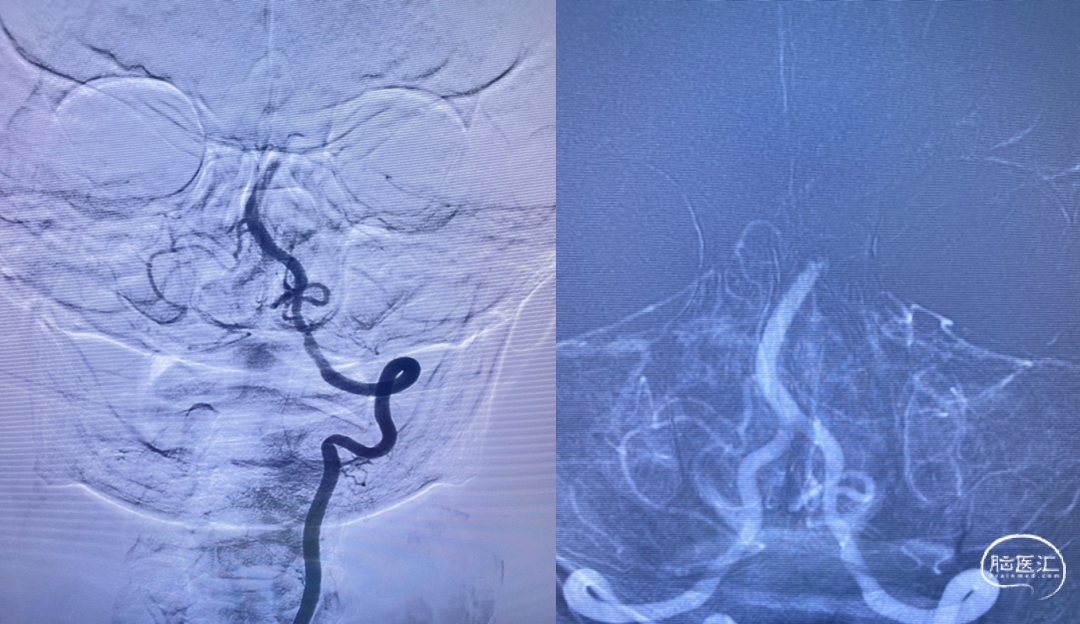 脑血管造影提示:左侧颈内动脉起始段重度狭窄,基底动脉尖闭塞,栓塞可能性大