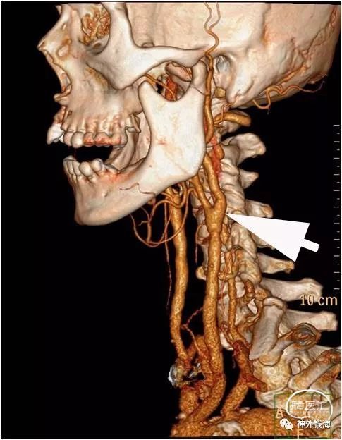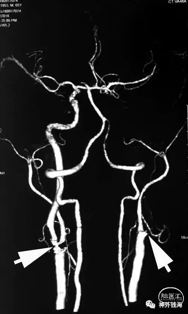 从患者的CTA看,供应脑部最重要的一根血管-右侧颈内动脉已经闭塞。但是颅内血管看起来还可以。左侧箭头示左侧颈内动脉重度狭窄,右侧箭头示右侧颈内动脉已经闭塞。