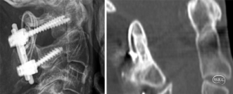 图2. CT成像显示,C2椎板固定后骨不连。移植物与C1融合,但未与C2融合。螺钉周围有透亮区(箭头)。