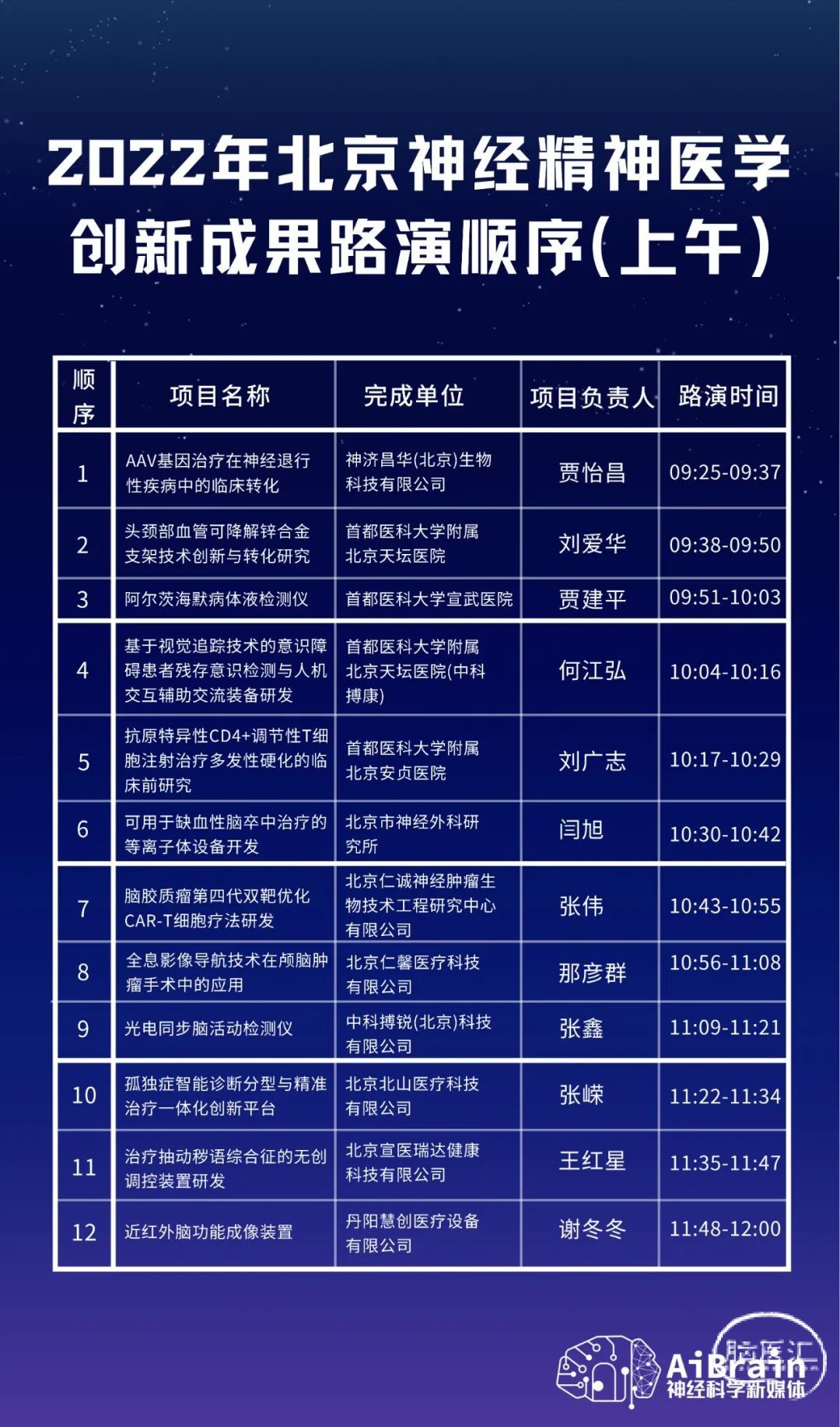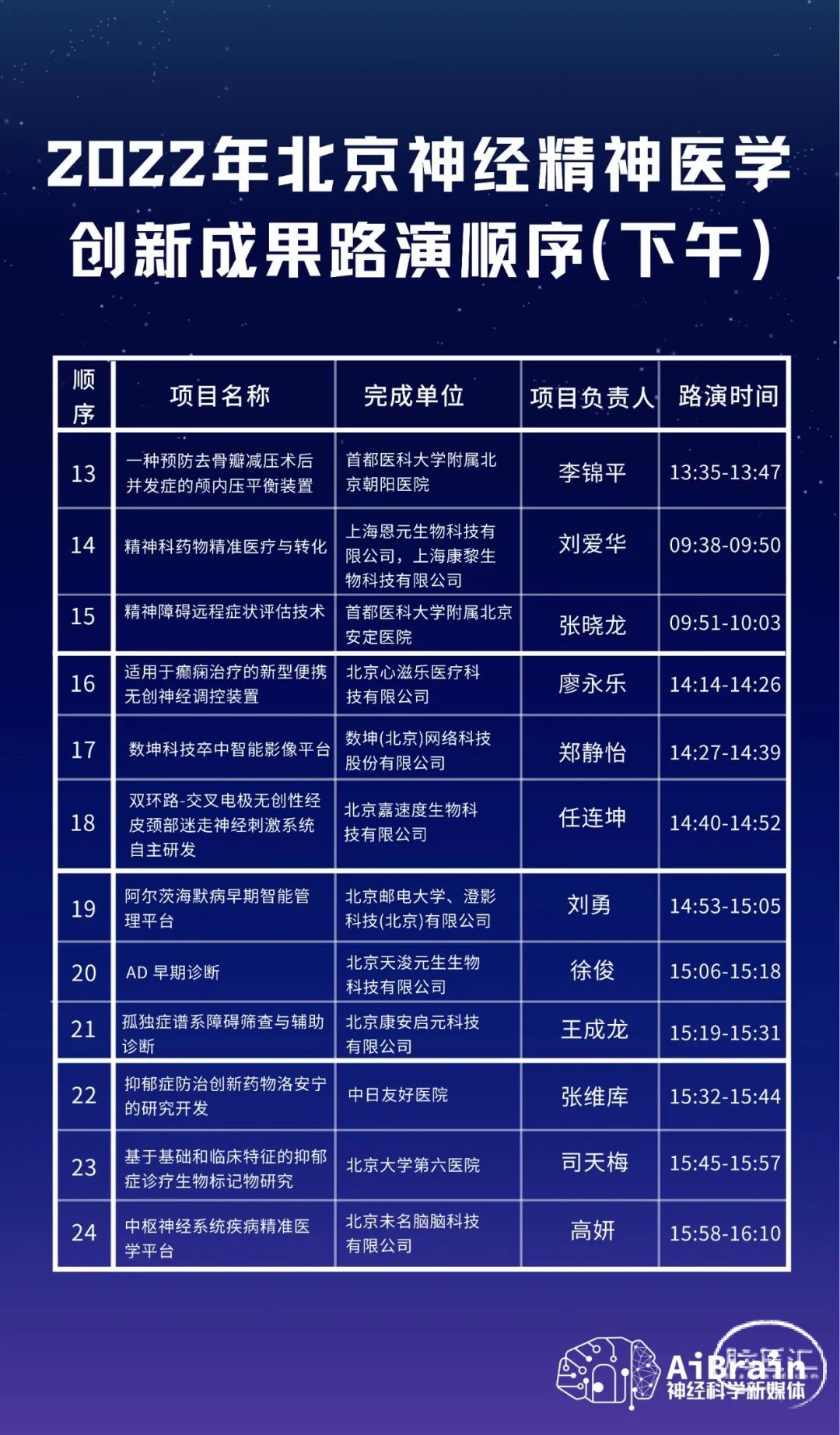 由项目方以PPT形式做项目报告,邀请国内神经精神领域的学术“大咖”按评审标准进行评价,依据综合得分进行排序,选出“2022神经精神医学创新成果TOP10”,并由北京神经科学学会颁发证书。参评项目给予免费进行现场展示机会,并对接不少于10家的技术需求企业或投资机构。