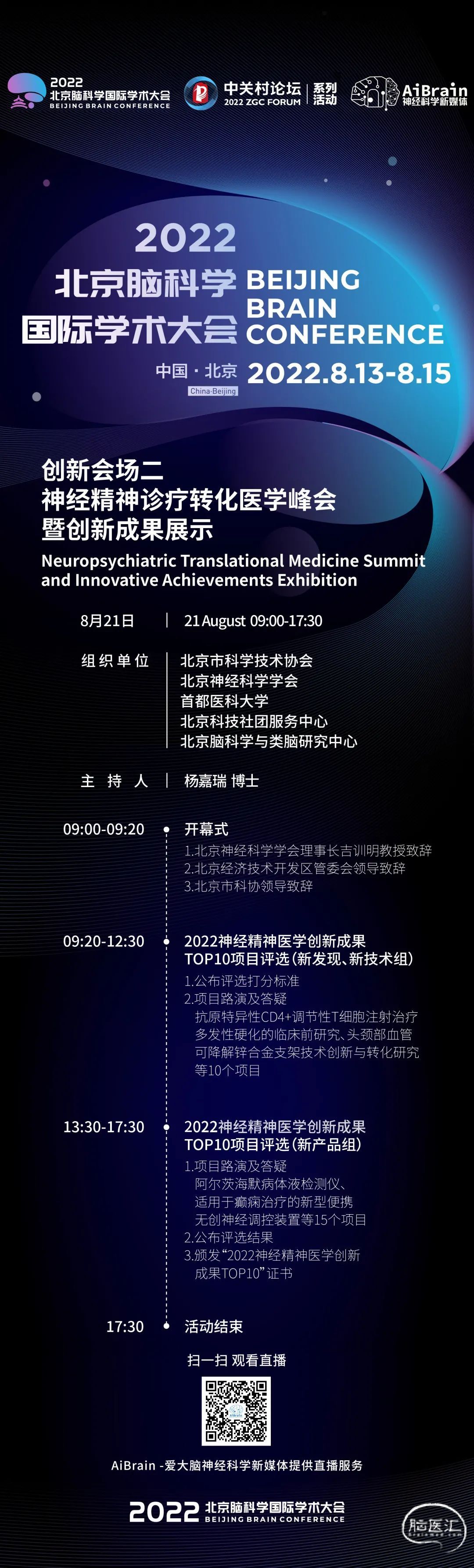 作为中关村论坛系列活动之一的“2022北京脑科学国际学术大会神经精神诊疗转化医学峰会暨创新成果展示活动”将于2022年8月21日在北京经济技术开发区亦城时代广场盛大启幕。