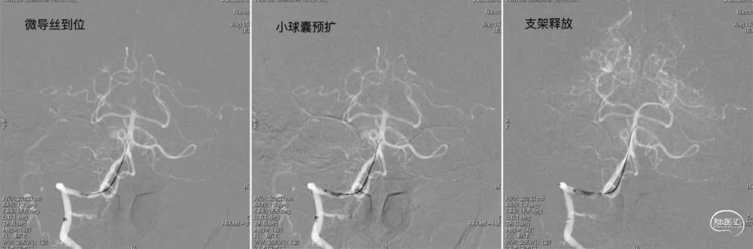 在颅内支撑导管支撑下,将0.014'' 300cm微导丝,通过狭窄节段将其放置在基底动脉中段。将2.0mm*10mm球囊打起预扩狭窄部位,然后更换赛诺神畅 颅内药物洗脱支架NOVA DES® 2.5*10mm延微导丝顺利通过狭窄节段,再次造影见定位准确,缓慢扩张球囊释放支架。