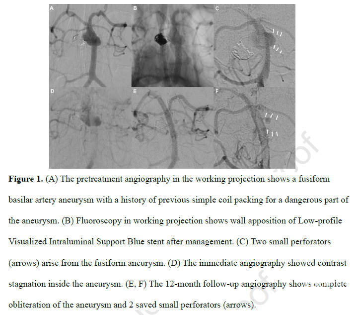 图1. (A)治疗前工作角度造影显示既往弹簧圈栓塞过危险部位的基底动脉梭形动脉瘤。(B)工作角度透视显示治疗后支架在血管壁上的位置。(C)2个小穿支血管(箭)从梭形动脉瘤上发出。(D)即刻造影显示动脉瘤内对比剂滞留。(E、F)12个月后的造影随访显示动脉瘤完全闭塞,2个穿支得以保留(箭)。