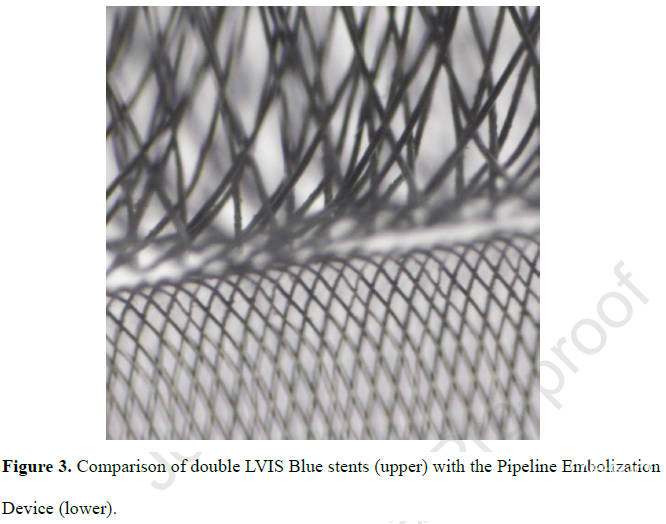 图3. 双层LVIS BLUE支架(上部)与Pipeline栓塞装置的比较