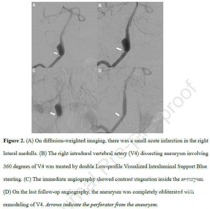 图2. (A)DWI图像显示右侧延髓小急性梗塞。(B)使用双层LVIS BLUE支架治疗360°累及V4的右侧硬膜内椎动脉(V4)夹层动脉瘤。(C)即刻造影显示动脉瘤内对比剂滞留。(D)最后一次造影随访中,动脉瘤完全闭塞,V4椎动脉得以重塑。箭示动脉瘤上发出的穿支血管。