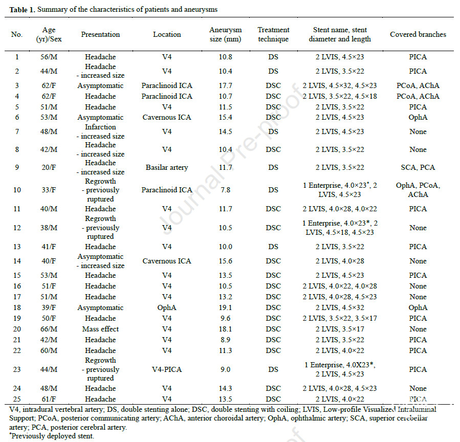 表1. 患者及动脉瘤特征总结
