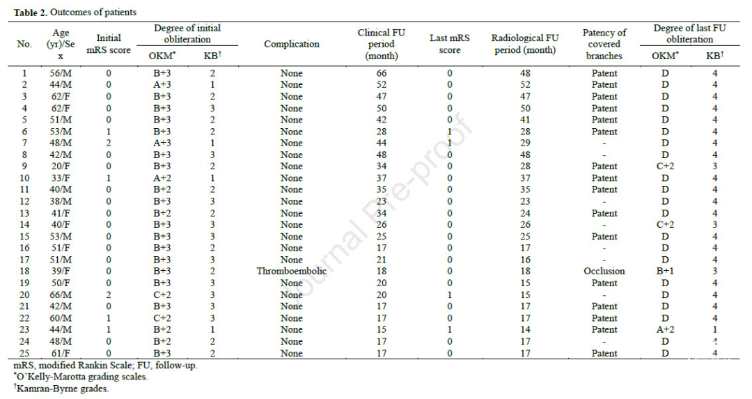 技术成功率100%(25/25)。6个(24.0%)动脉瘤位于前循环,19个(76.0%)动脉瘤位于后循环。术中栓塞性并发症出现1例(4.0%)。随访期间(30.8 ± 14.2个月),没有死亡或延迟并发症出现。平均影像随访时长为28.2 ± 12.8个月。随访造影显示,21例(84.0%)完全闭塞(O’Kelly-Marotta [OKM] D),2例(8.0%)近全闭塞(OKM C+2 matched with Kamran-Byrne grade 3)。2例(8.0%)患者表现出更差的闭塞等级。1例(4.0%)患者需要再次治疗。没有显著的支架内再狭窄或分支闭塞。