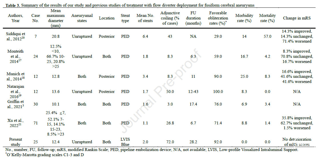 表3. 作者研究及既往对血流导向装置治疗梭形脑动脉瘤研究的总结