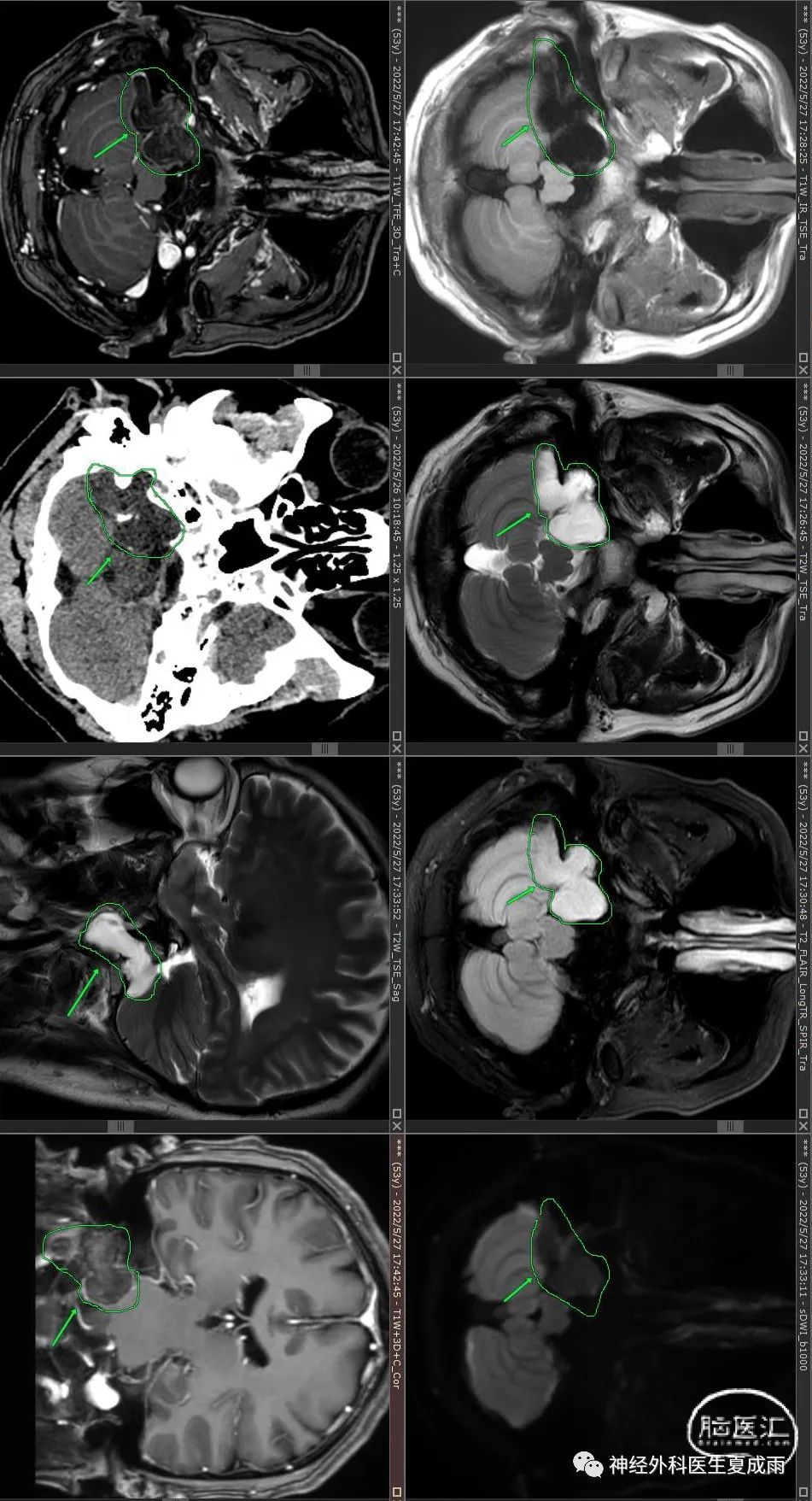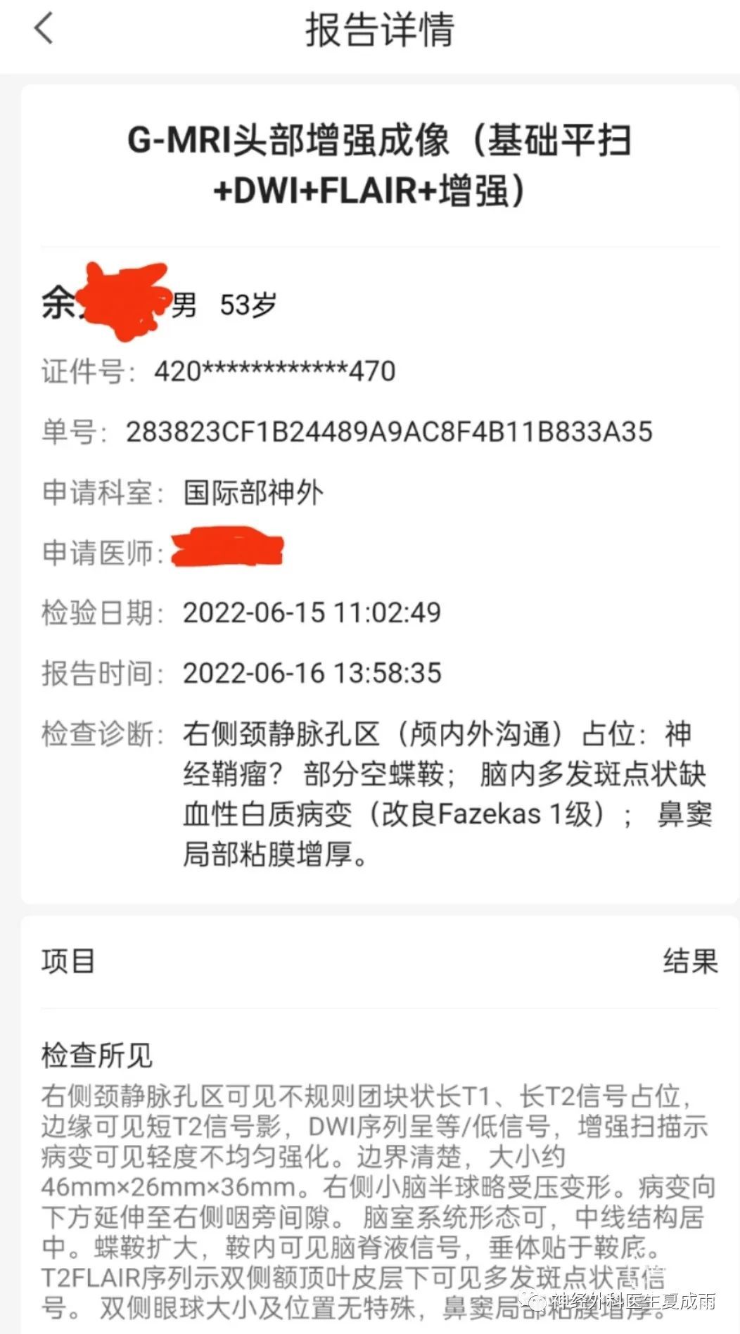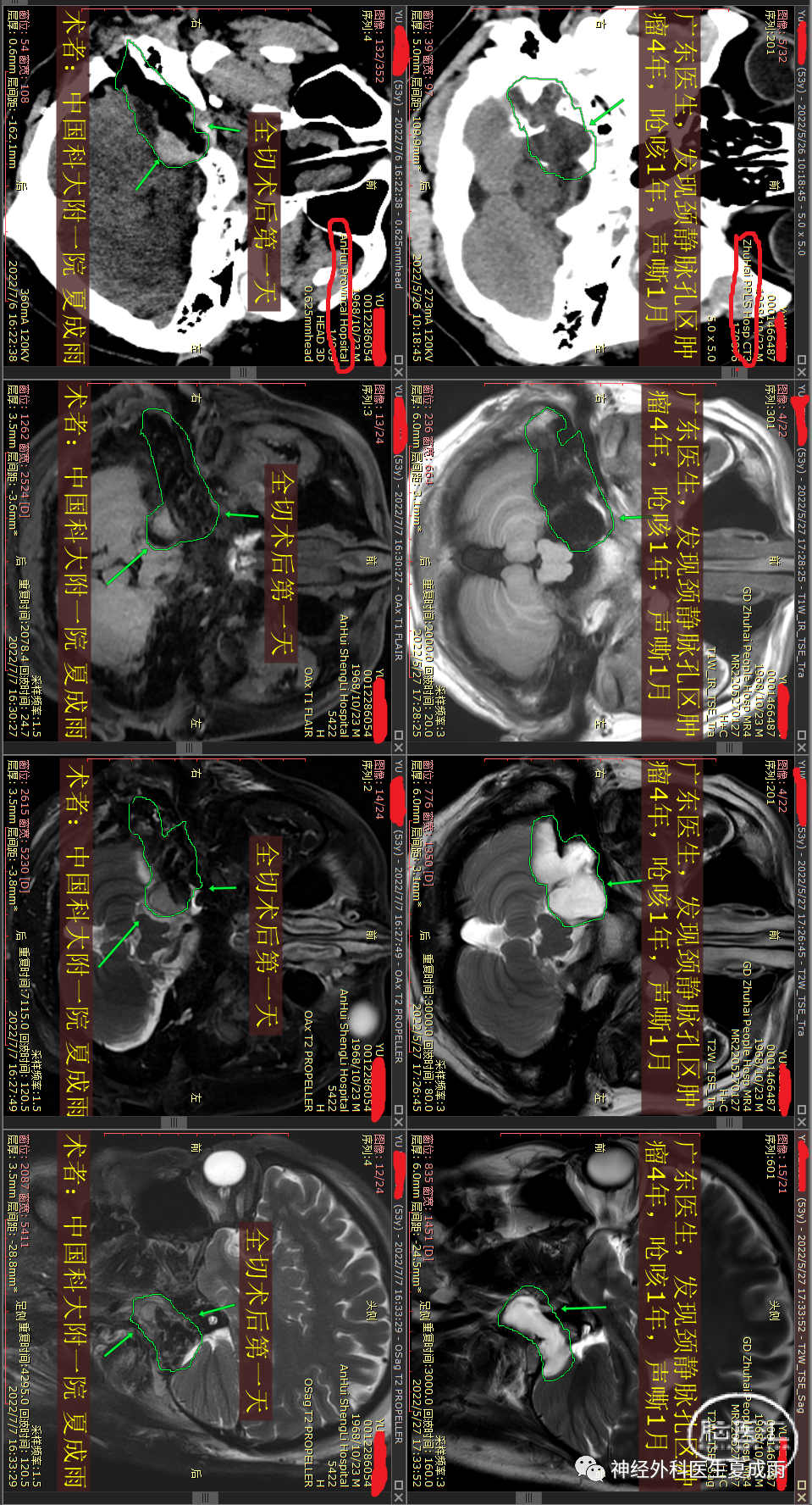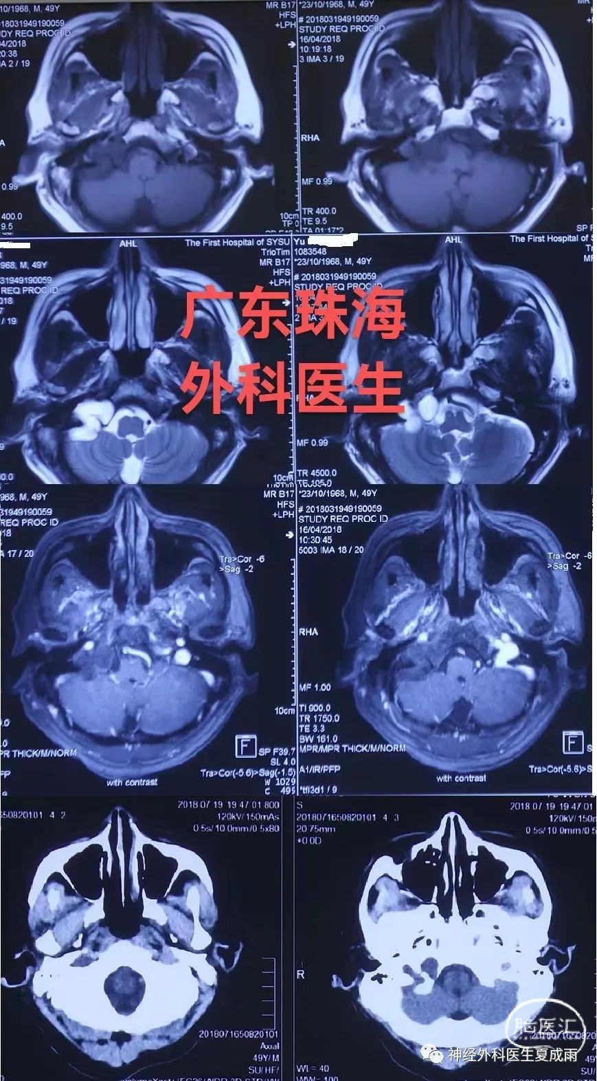 广东珠海市一名外科医生,男,53岁,2018年时因“头晕5~6年”在广州检查磁共振发现“颈静脉孔区占位”。