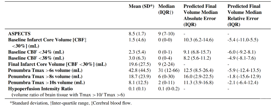 在对CBF>0 mL和<38%的患者进一步分析中,与CBF<30%(r2=0.55 平均绝对误差为17.7 mL [IQR 12.2-32.9])和CBF<38%(r2=0.58平均绝对误差为12.1 mL [IQR 7.2-32.2])相比,CBF<34%时与脑梗死最终体积相关性略强(r2=0.60 平均绝对误差为22.3 mL [IQR 15.8-27.8])。