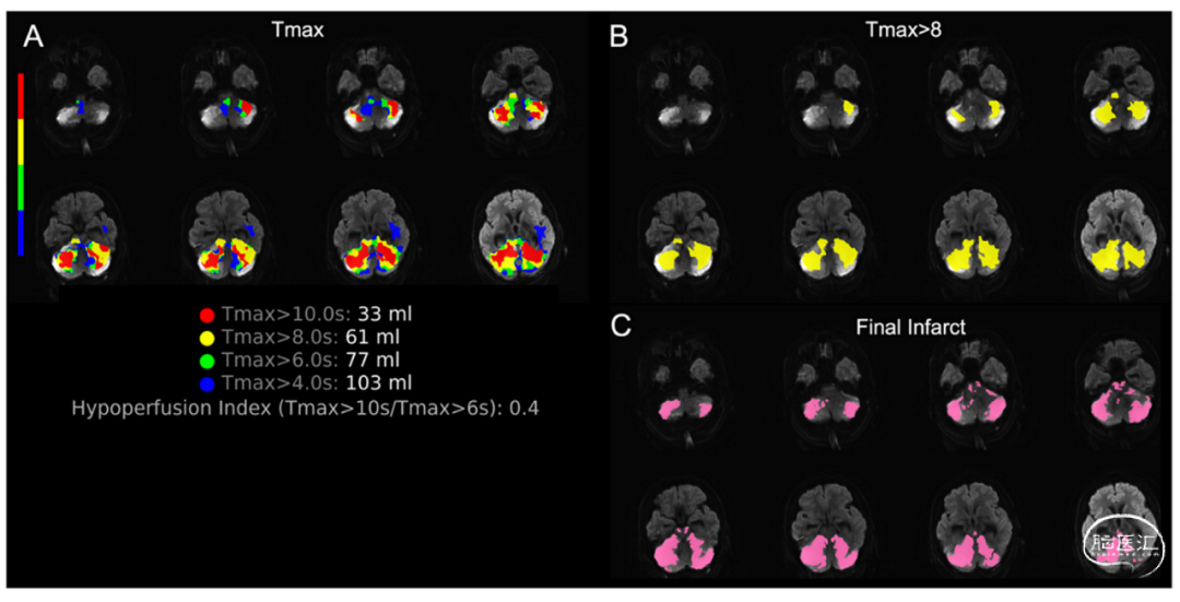 图1.具代表性患者的影像图,CT影像与DWI进行融合。A、CT灌注影像中不同Tmax时感兴趣区域体积。B、Tmax>8s(黄色区域)。C、DWI影像中最终梗死体积(粉红色区域)。